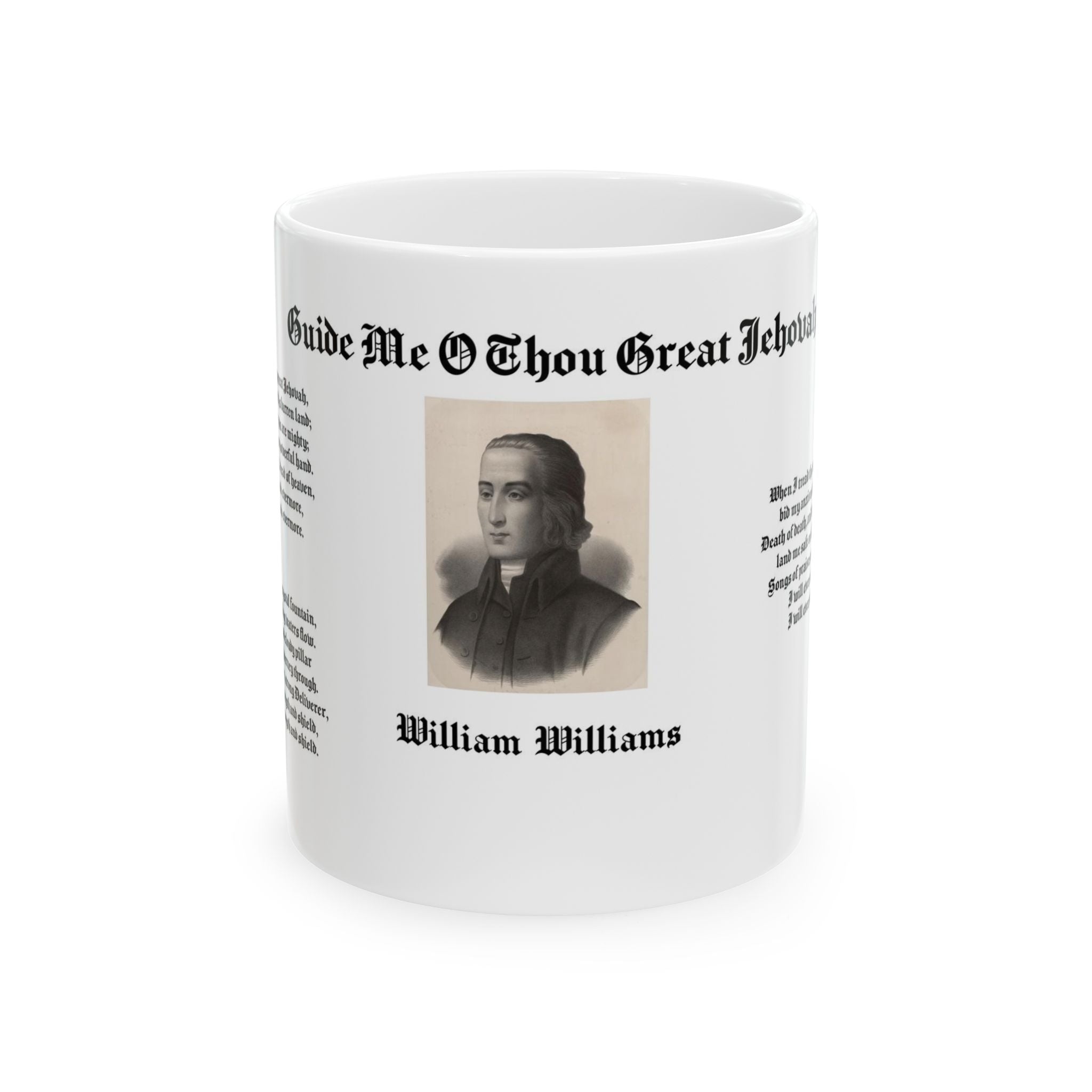 Sip your morning coffee or tea from this one-of-a-kind mug, featuring the words to William Williams beloved hymn, "Guide Me O Thou Great Jehovah". This personalized 11-ounce ceramic white mug is microwavable and dishwasher safe, with rounded corners and a convenient C-handle. As a bonus, it's lead free. The advanced printing technology ensures your design comes to life, making this an ideal gift for lovers of coffee, tea, and hot chocolate. Give yourself or someone special a unique gift that will remind them of there favorite hymn that will be cherished for years to come!