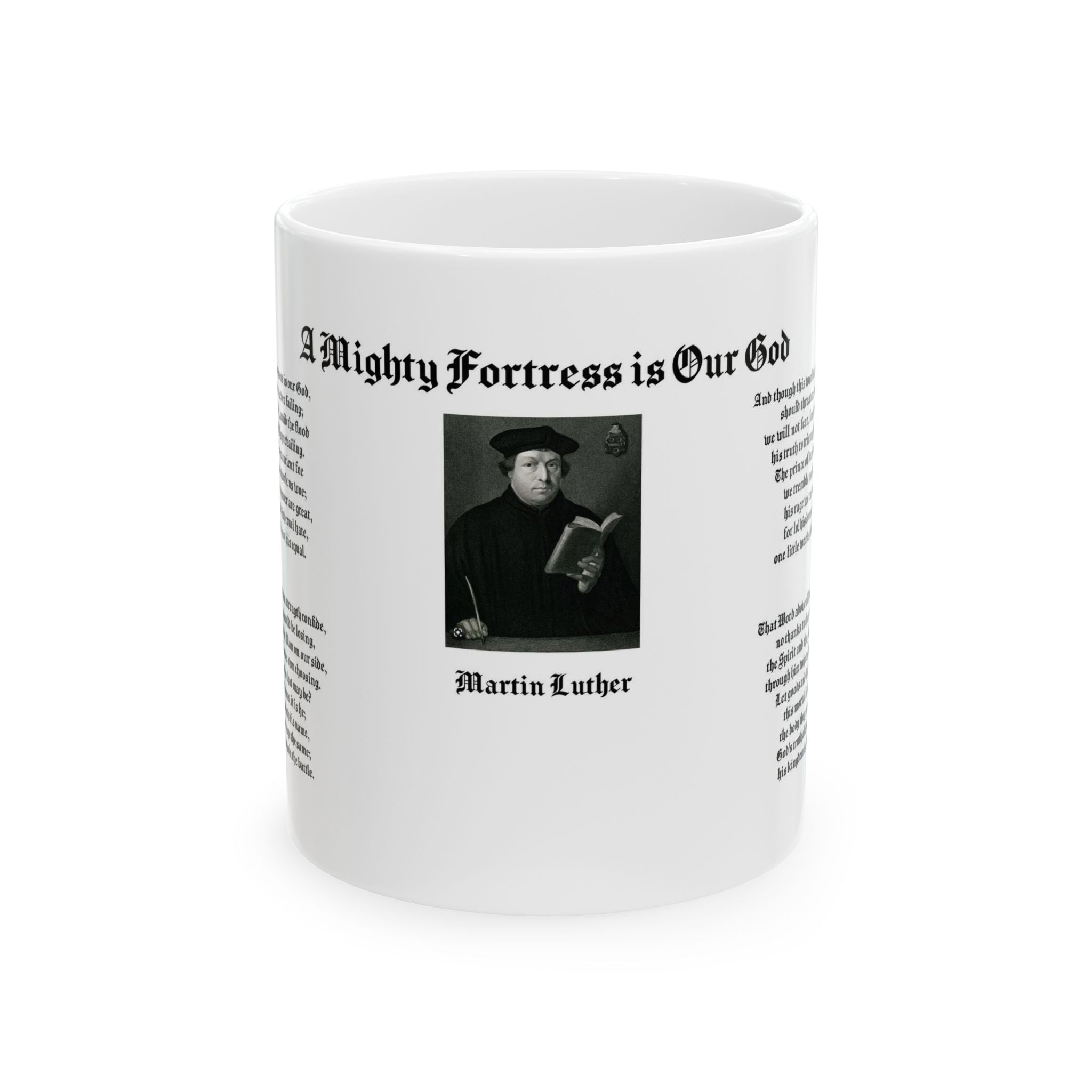 Sip your morning coffee or tea from this one-of-a-kind mug, featuring the words to Martin Luther's beloved hymn, "A Mighty Fortress is Our God". This personalized 11-ounce ceramic white mug is microwavable and dishwasher safe, with rounded corners and a convenient C-handle. As a bonus, it's lead free. The advanced printing technology ensures your design comes to life, making this an ideal gift for lovers of coffee, tea, and hot chocolate. Give yourself or someone special a unique gift that will remind them of there favorite hymn that will be cherished for years to come!