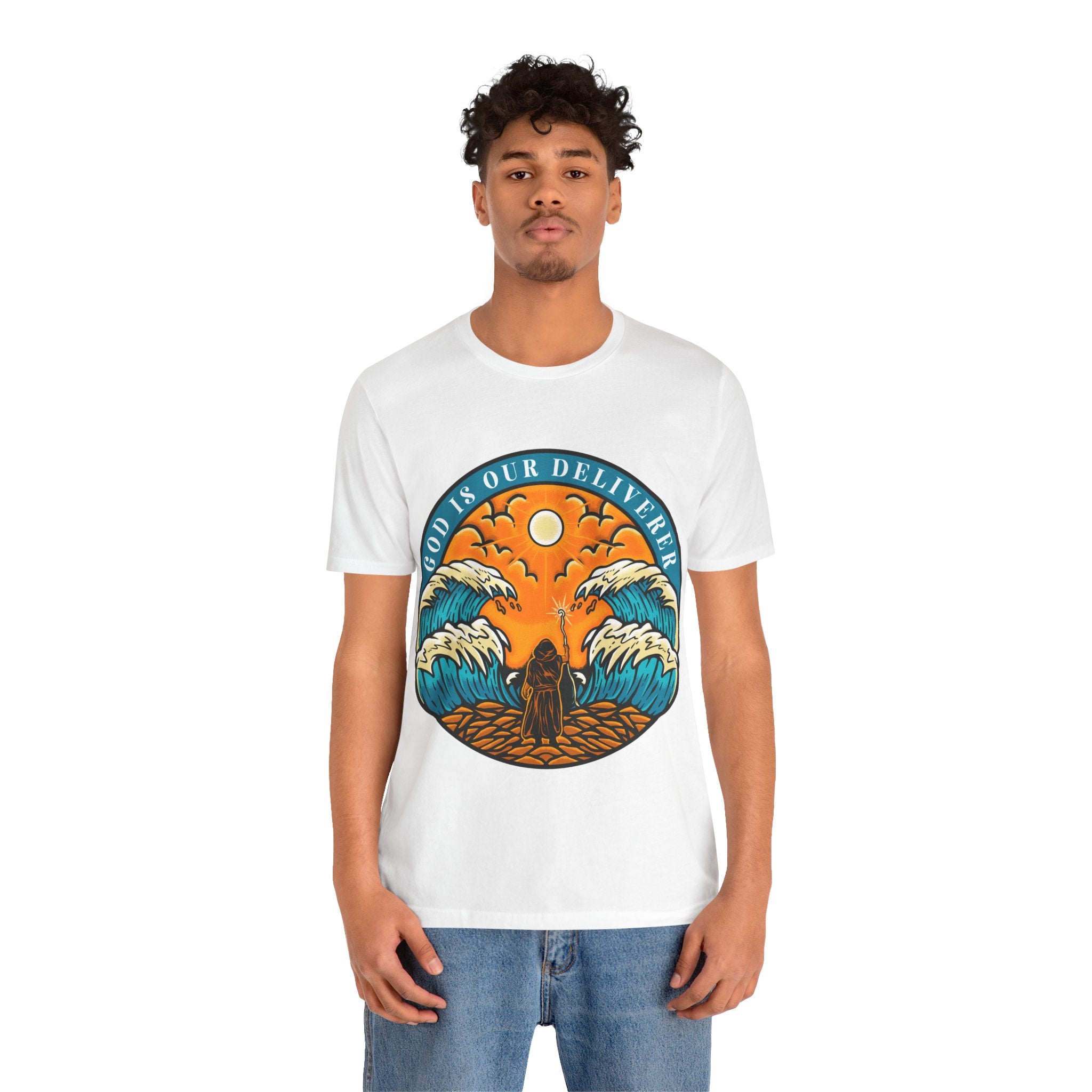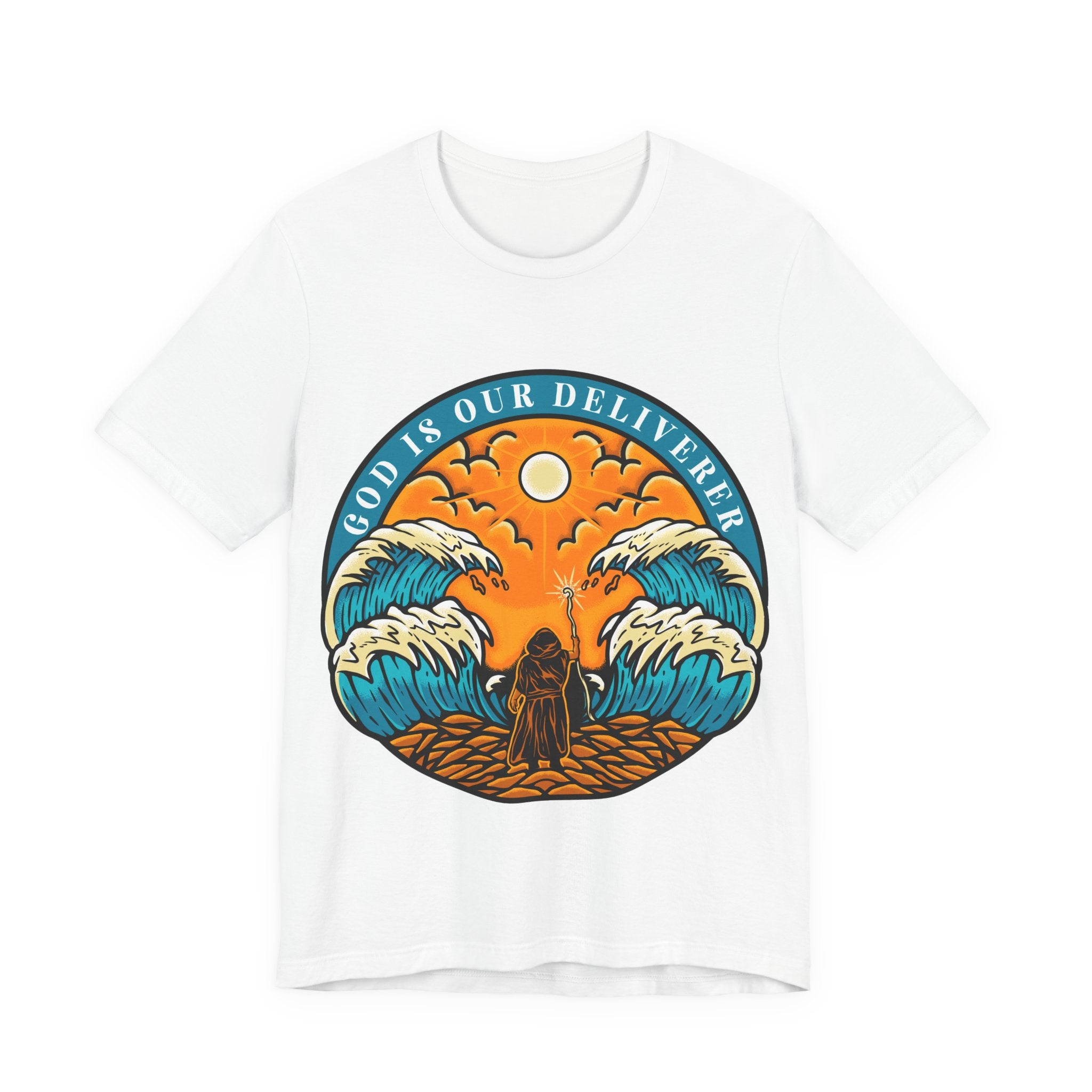 There is a nice picture on the front of a white Christian t-shirt that says "God is our deliverer." This beautiful themed graphic is printed on a clean white background. The t shirt is lightweight and offers a classic style.