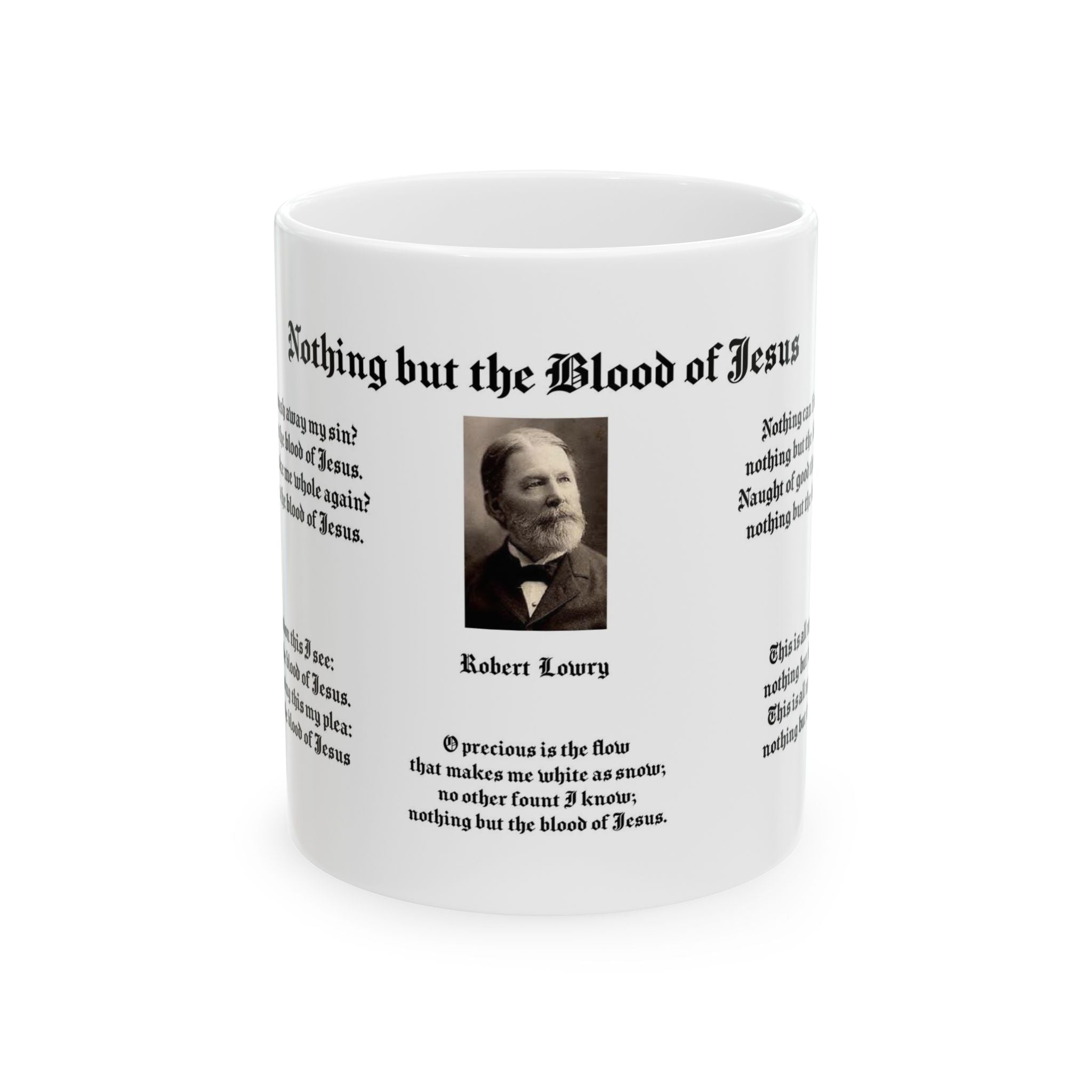 Sip your morning coffee or tea from this one-of-a-kind mug, featuring the words to Robert Lowry beloved hymn, "Nothing But the Blood of Jesus". This personalized 11-ounce ceramic white mug is microwavable and dishwasher safe, with rounded corners and a convenient C-handle. As a bonus, it's lead free. The advanced printing technology ensures your design comes to life, making this an ideal gift for lovers of coffee, tea, and hot chocolate. Give yourself or someone special a unique gift that will remind them of there favorite hymn that will be cherished for years to come!