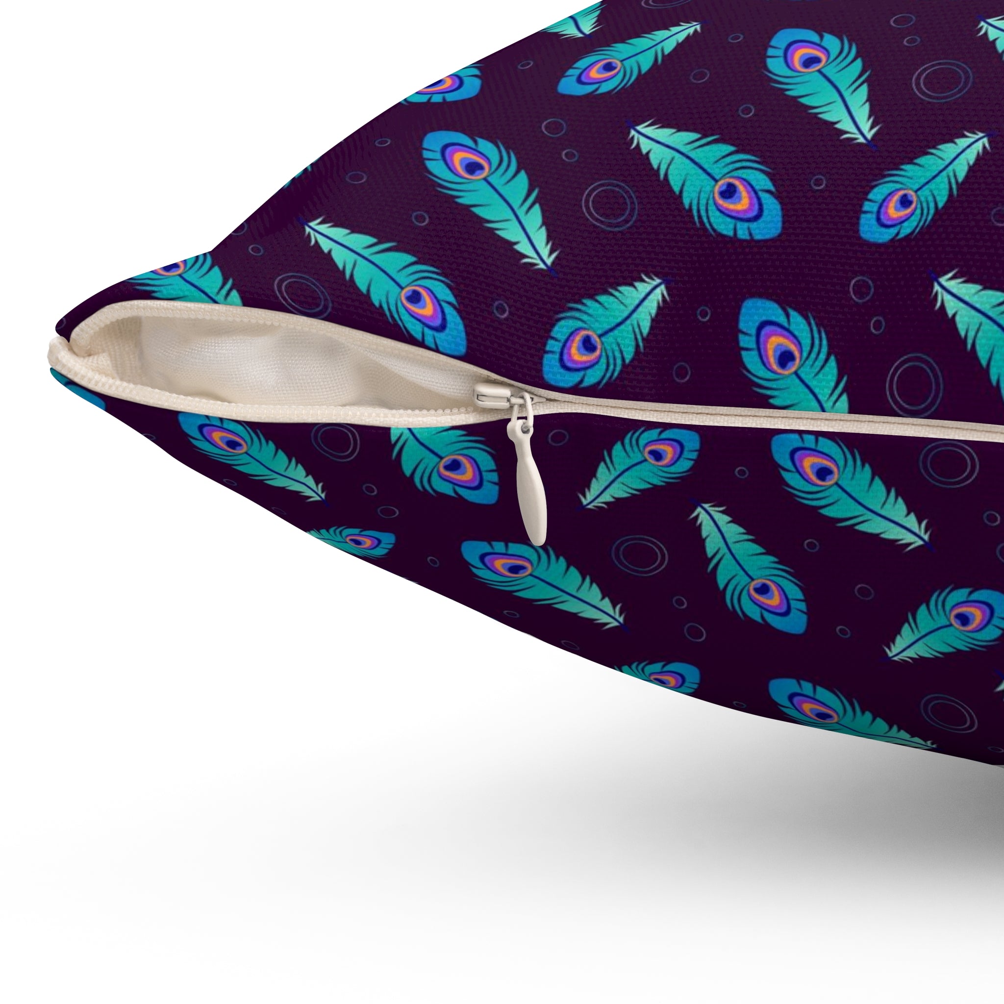 Introducing the Peacock Feather Pillow, the perfect home decor to add a touch of sophistication to any room. The pillow features a beautiful peacock feather print all over, designed to add a sense of luxury to any interior. With a 100% polyester cover and a 100% polyester pillow, this luxurious cushion is both comfortable and visually stunning. The double sided print ensures that the artwork looks beautiful from every angle and the concealed zipper allows for easy removal and cleaning. Pre-constructed for convenience, the item has a size variance of +/- 0.5" for a perfect fit. Ideal for any home, the Peacock Feather Pillow is sure to make a statement.