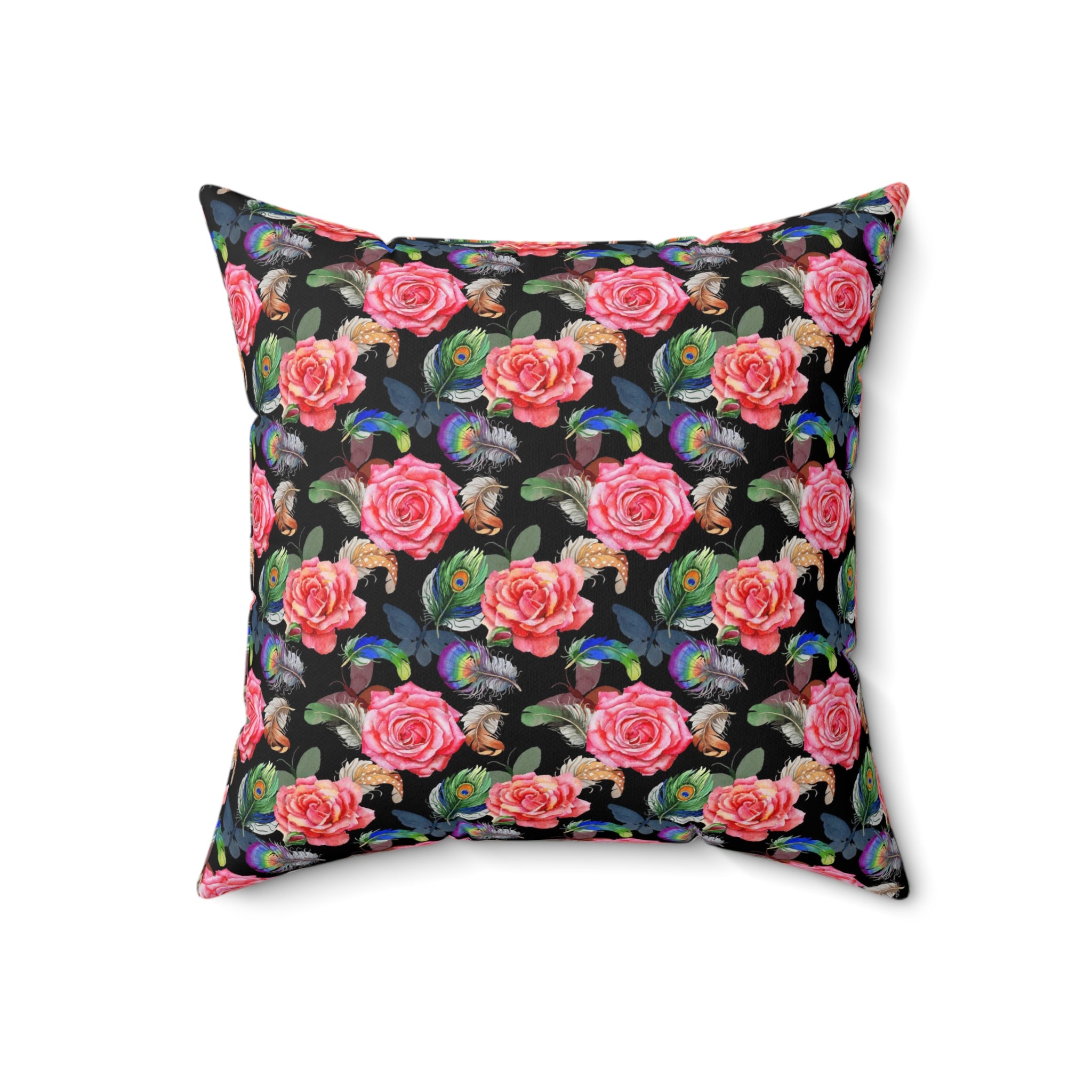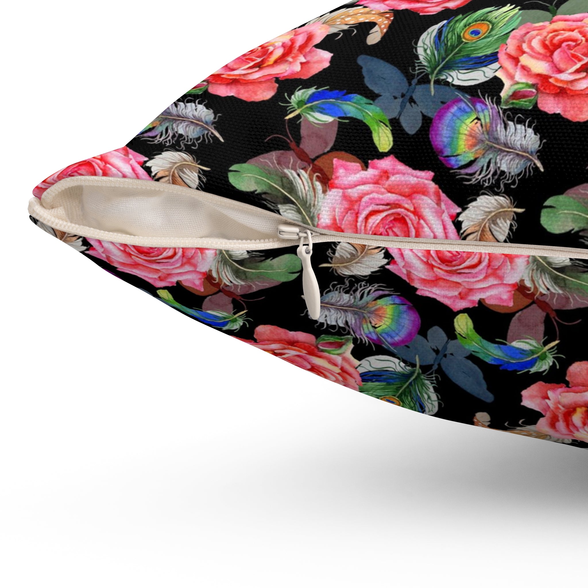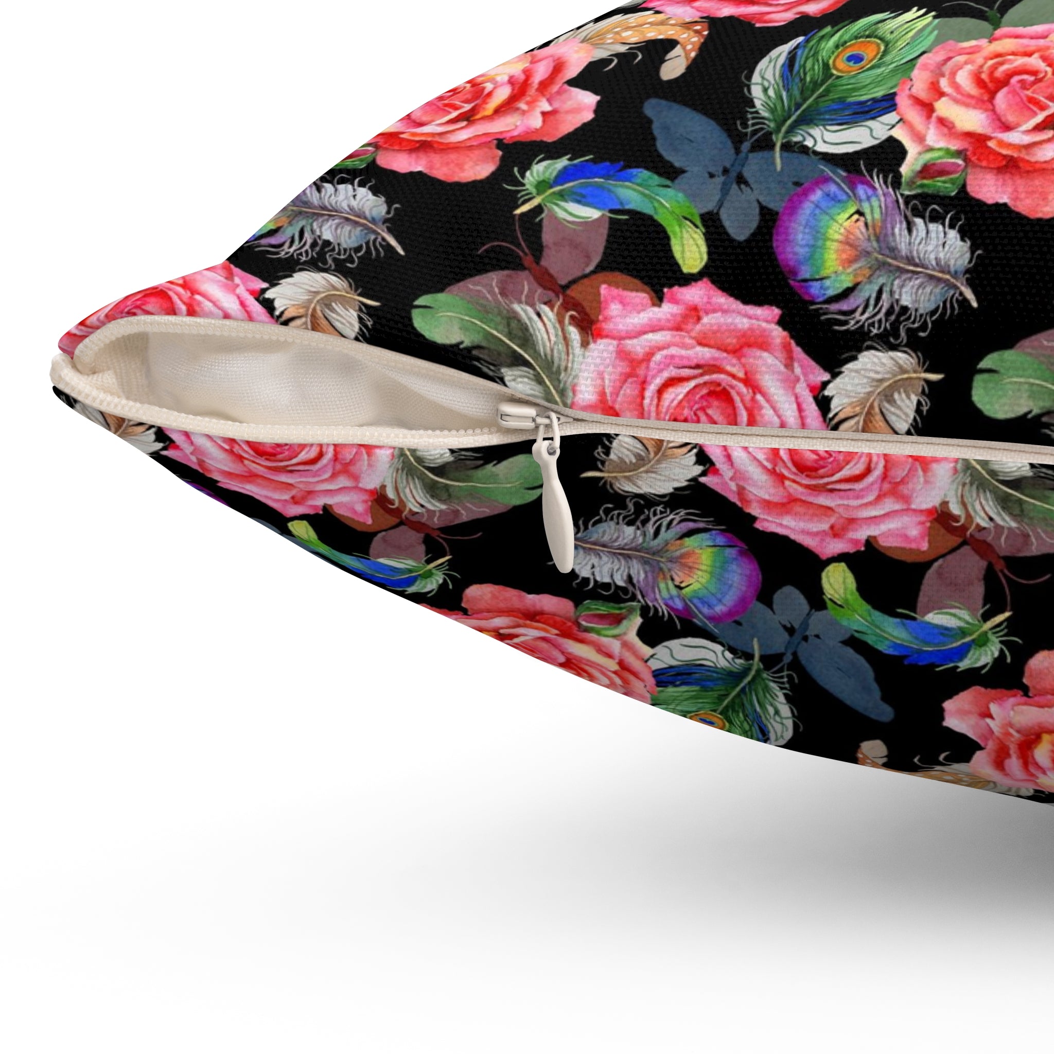Introducing the Peacock Feather Pillow, the perfect home decor to add a touch of sophistication to any room. The pillow features a beautiful peacock feather print all over, this one also has roses all over the print as well. Designed to add a sense of luxury to any interior. With a 100% polyester cover and a 100% polyester pillow, this luxurious cushion is both comfortable and visually stunning. The double sided print ensures that the artwork looks beautiful from every angle and the concealed zipper allows for easy removal and cleaning. Pre-constructed for convenience, the item has a size variance of +/- 0.5" for a perfect fit. Ideal for any home, the Peacock Feather Pillow is sure to make a statement.