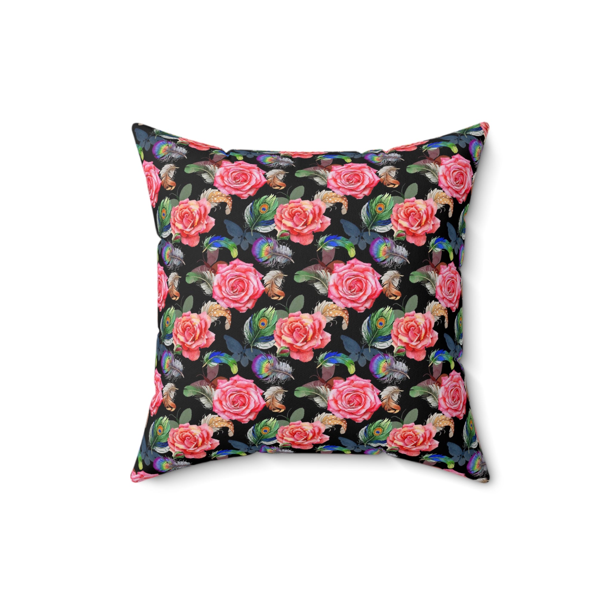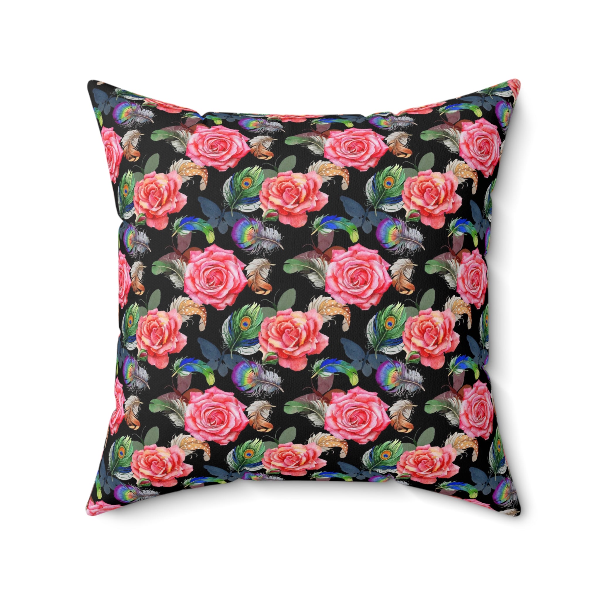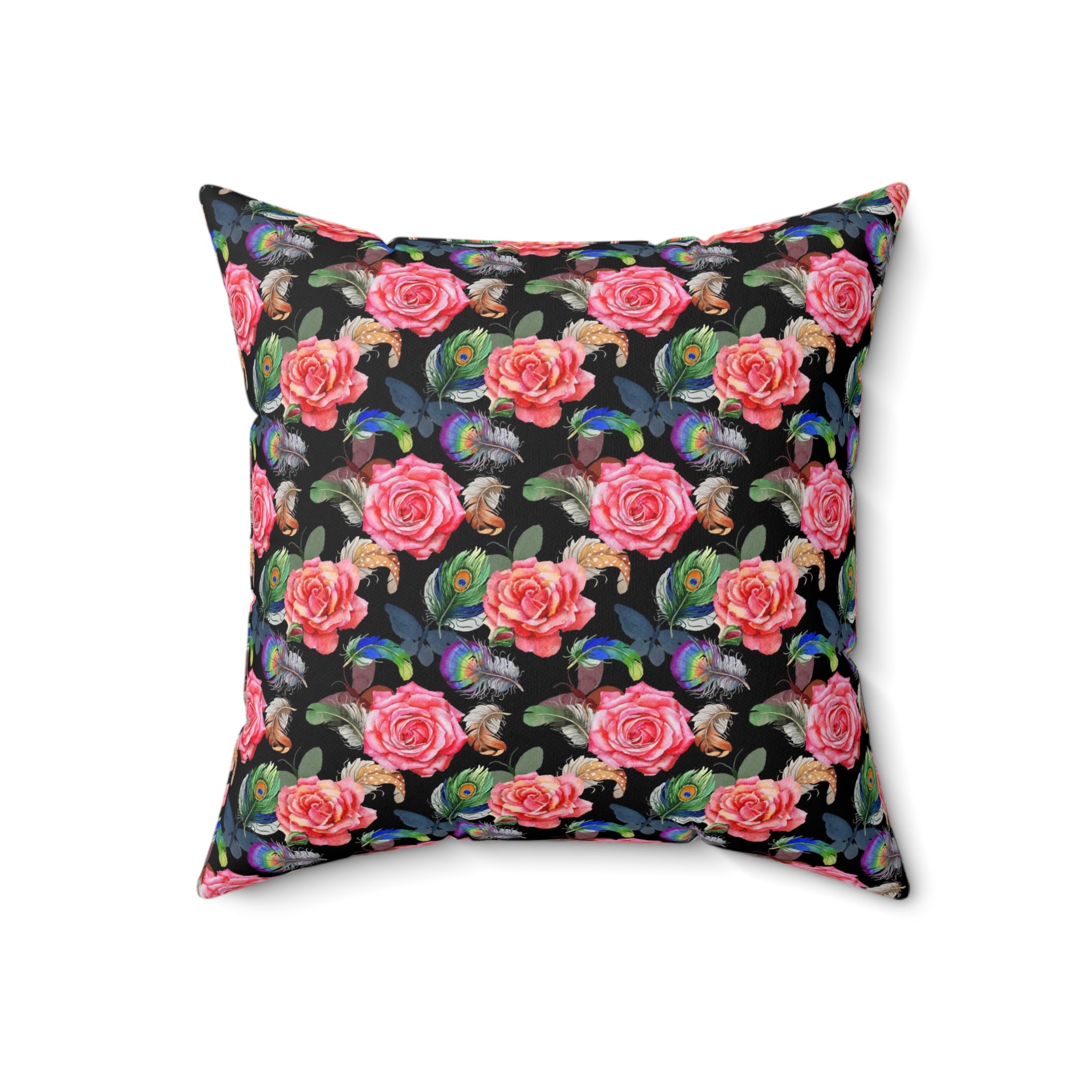 Introducing the Peacock Feather Pillow, the perfect home decor to add a touch of sophistication to any room. The pillow features a beautiful peacock feather print all over, this one also has roses all over the print as well. Designed to add a sense of luxury to any interior. With a 100% polyester cover and a 100% polyester pillow, this luxurious cushion is both comfortable and visually stunning. The double sided print ensures that the artwork looks beautiful from every angle and the concealed zipper allows for easy removal and cleaning. Pre-constructed for convenience, the item has a size variance of +/- 0.5" for a perfect fit. Ideal for any home, the Peacock Feather Pillow is sure to make a statement.
