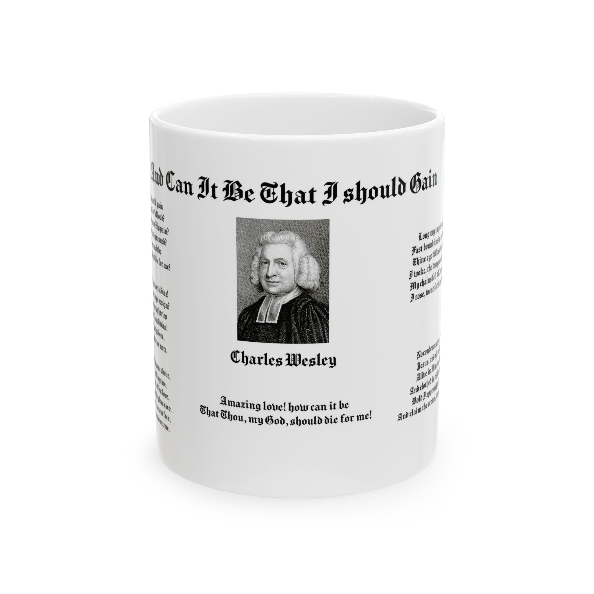Sip your morning coffee or tea from this one-of-a-kind mug, featuring the words to John Wesley beloved hymn, "And Can It Be That I Should Gain". This personalized 11-ounce ceramic white mug is microwavable and dishwasher safe, with rounded corners and a convenient C-handle. As a bonus, it's lead free. The advanced printing technology ensures your design comes to life, making this an ideal gift for lovers of coffee, tea, and hot chocolate. Give yourself or someone special a unique gift that will remind them of there favorite hymn that will be cherished for years to come!