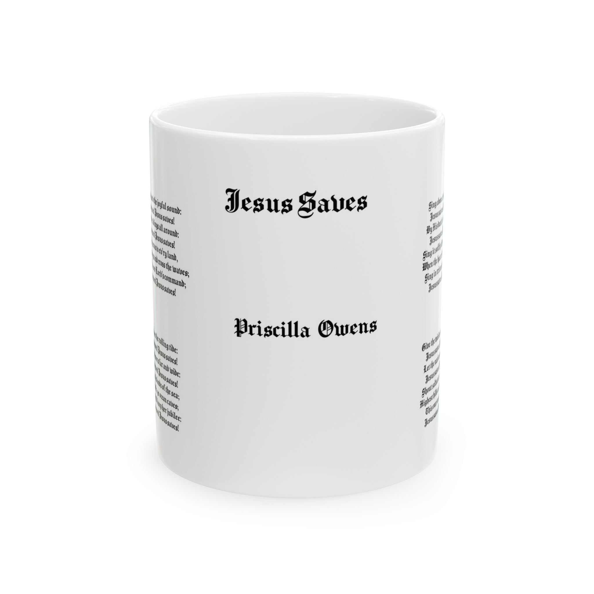 Sip your morning coffee or tea from this one-of-a-kind mug, featuring the words to Priscilla Owens beloved hymn, "Jesus Saves". This personalized 11-ounce ceramic white mug is microwavable and dishwasher safe, with rounded corners and a convenient C-handle. As a bonus, it's lead free. The advanced printing technology ensures your design comes to life, making this an ideal gift for lovers of coffee, tea, and hot chocolate. Give yourself or someone special a unique gift that will remind them of there favorite hymn that will be cherished for years to come!