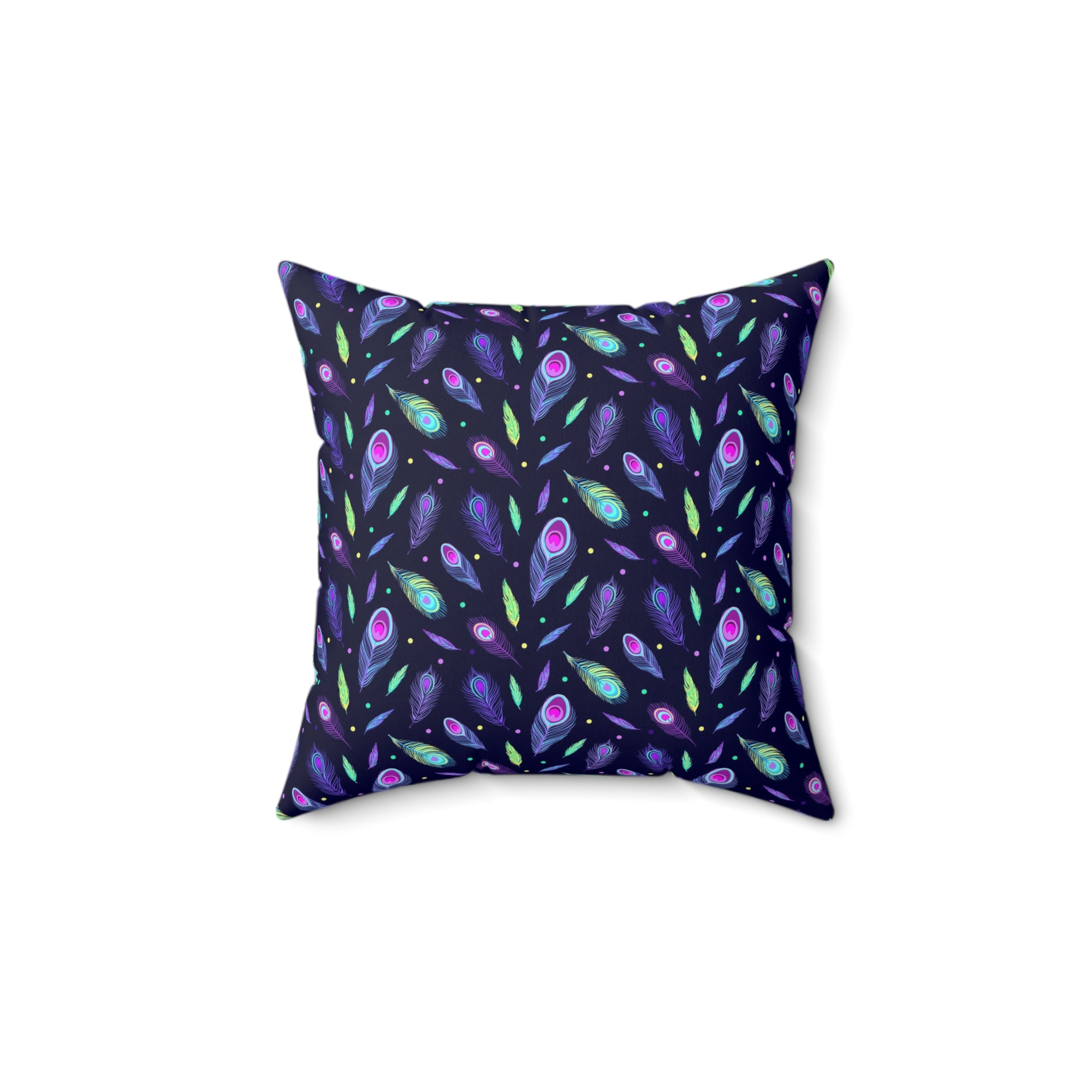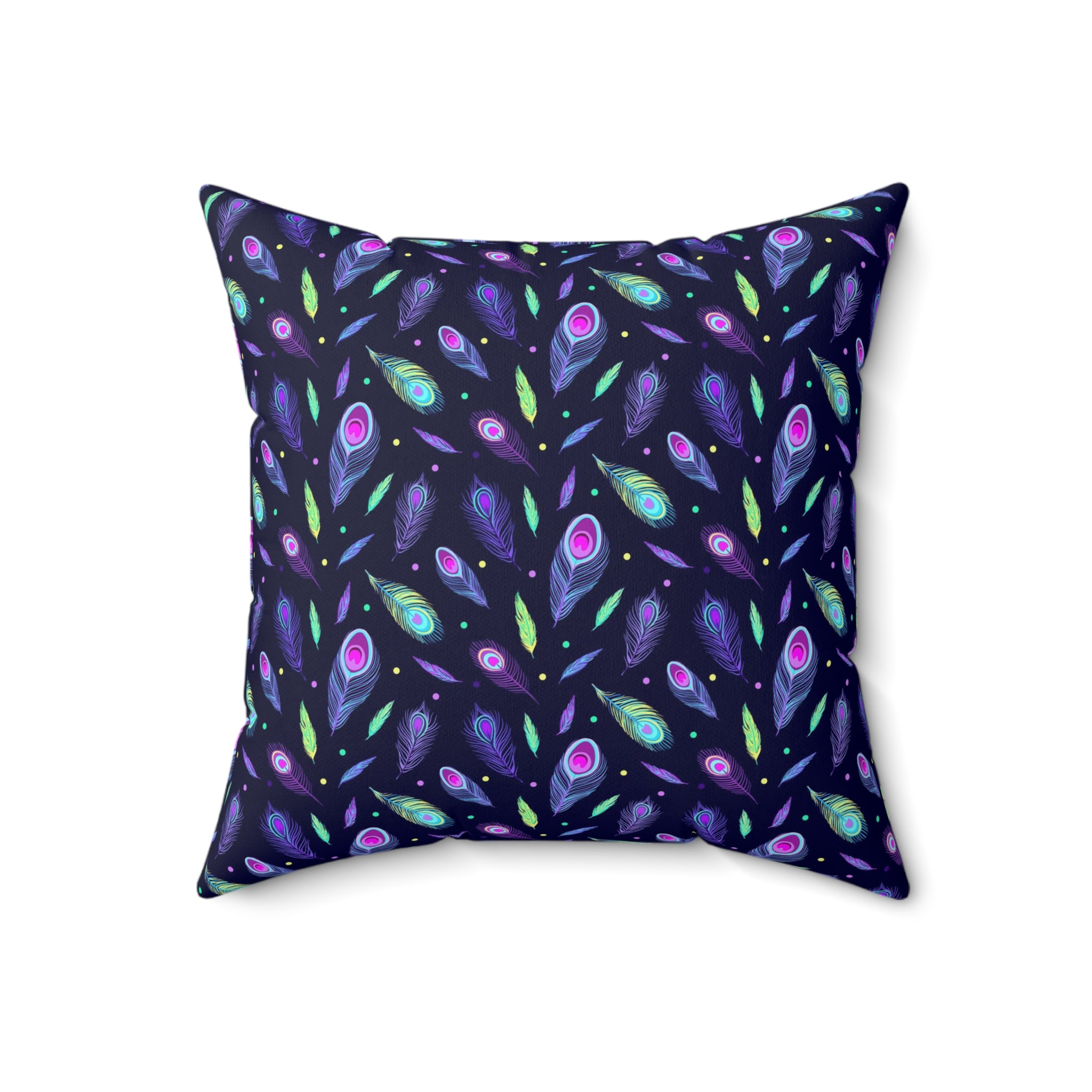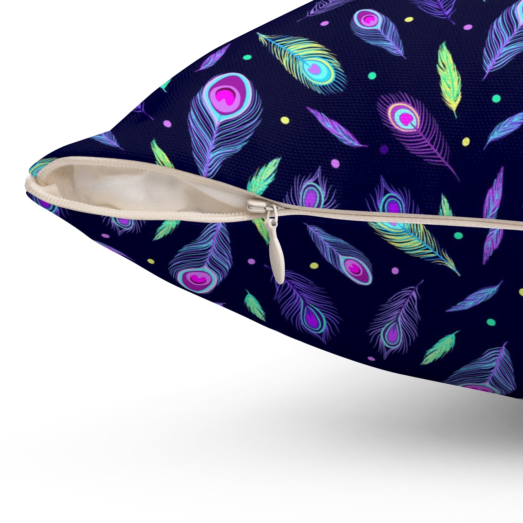 Introducing the Peacock Feather Pillow, the perfect home decor to add a touch of sophistication to any room. The pillow features a beautiful peacock feather print all over, designed to add a sense of luxury to any interior. With a 100% polyester cover and a 100% polyester pillow, this luxurious cushion is both comfortable and visually stunning. The double sided print ensures that the artwork looks beautiful from every angle and the concealed zipper allows for easy removal and cleaning. Pre-constructed for convenience, the item has a size variance of +/- 0.5" for a perfect fit. Ideal for any home, the Peacock Feather Pillow is sure to make a statement.