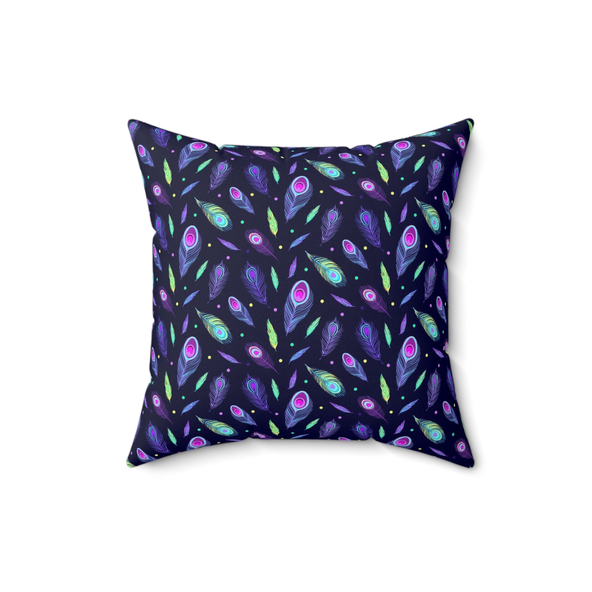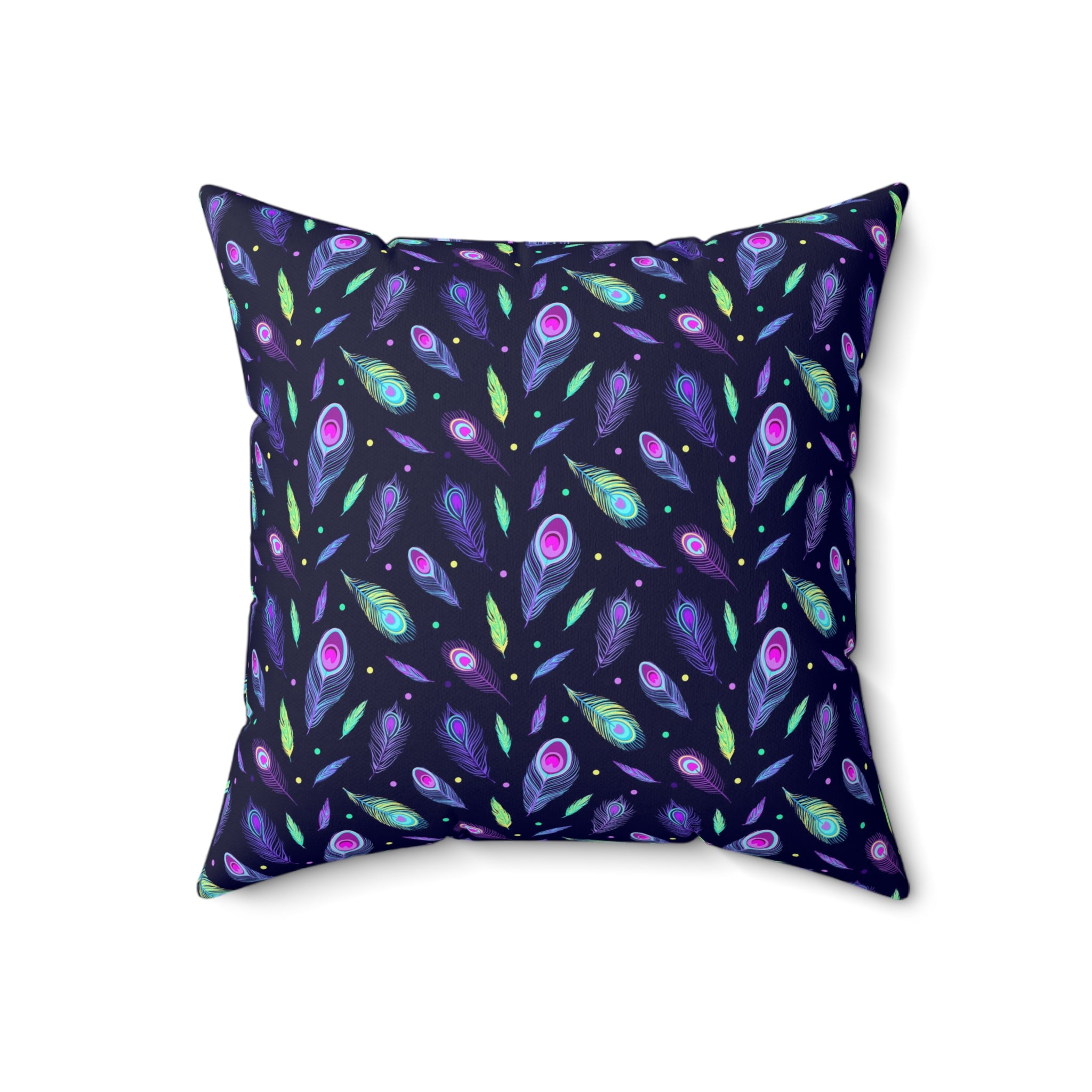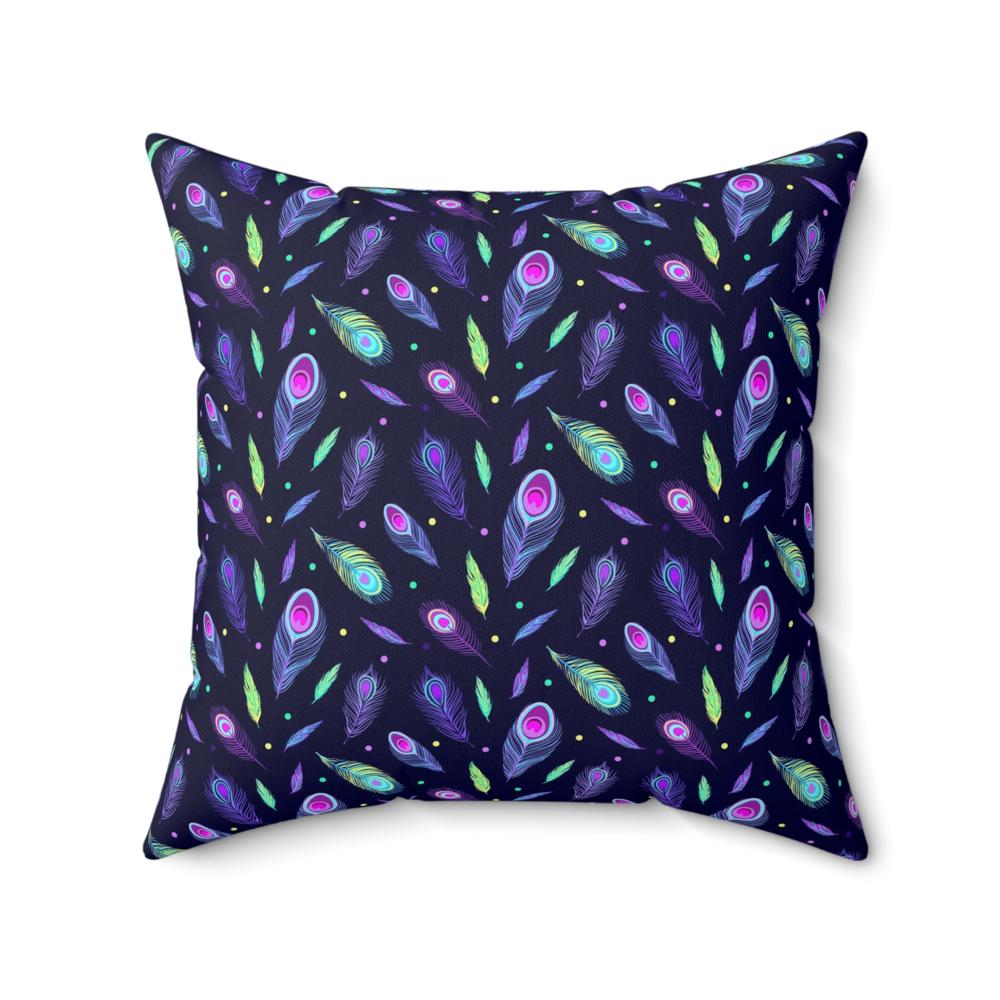 Introducing the Peacock Feather Pillow, the perfect home decor to add a touch of sophistication to any room. The pillow features a beautiful peacock feather print all over, designed to add a sense of luxury to any interior. With a 100% polyester cover and a 100% polyester pillow, this luxurious cushion is both comfortable and visually stunning. The double sided print ensures that the artwork looks beautiful from every angle and the concealed zipper allows for easy removal and cleaning. Pre-constructed for convenience, the item has a size variance of +/- 0.5" for a perfect fit. Ideal for any home, the Peacock Feather Pillow is sure to make a statement.