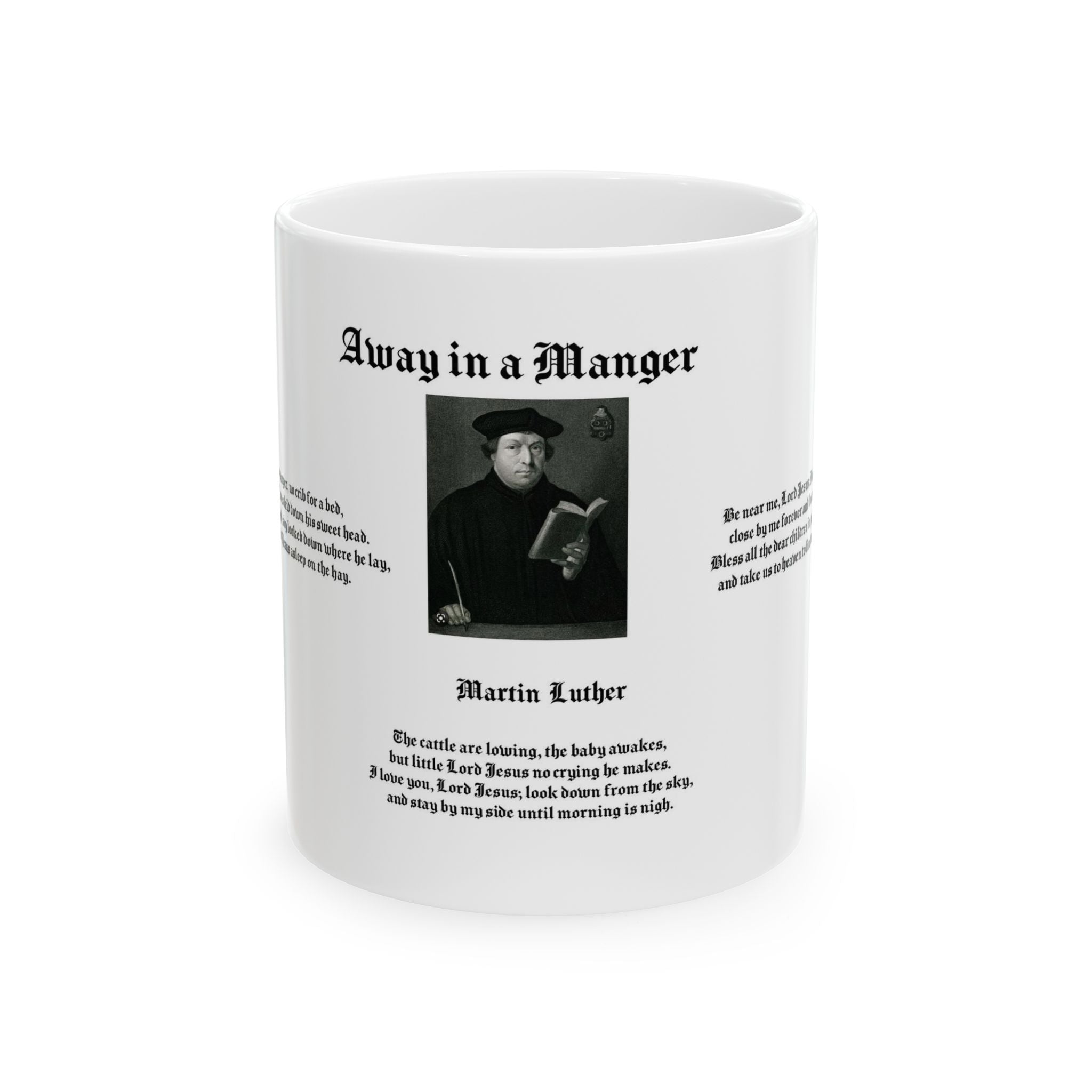 Sip your morning coffee or tea from this one-of-a-kind mug, featuring the words to Martin Luthers beloved Christmas Carol "Away in A Manger". This personalized 11-ounce ceramic white mug is microwavable and dishwasher safe, with rounded corners and a convenient C-handle. As a bonus, it's lead free. The advanced printing technology ensures your design comes to life, making this an ideal gift for lovers of coffee, tea, and hot chocolate. Give yourself or someone special a unique gift that will remind them of there favorite hymn that will be cherished for years to come!
