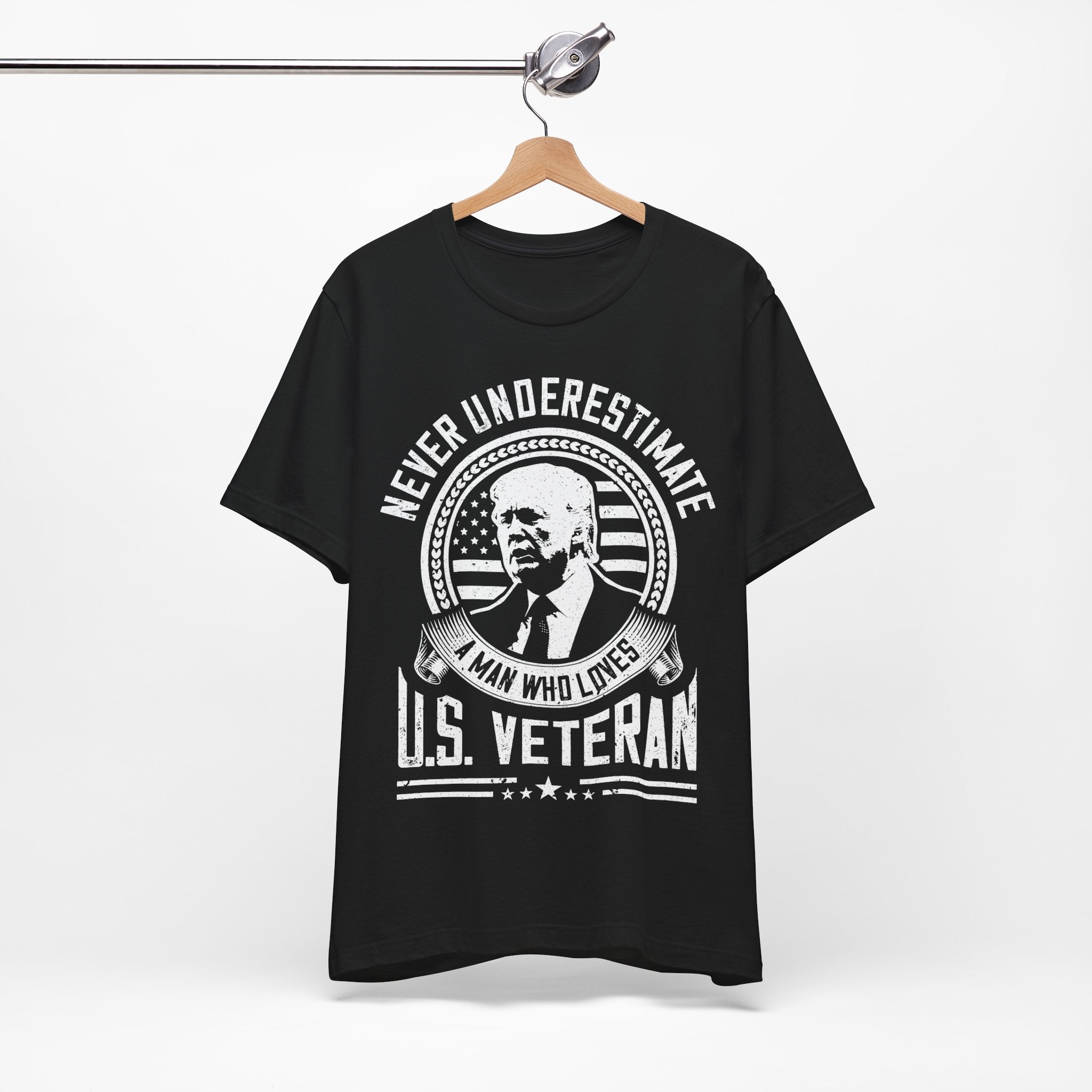 With the words "Never underestimate a man who loves US veterans." written In white ink on the front and a picture of US President Donald Trump enclosed in a beautifully designed circle with parts of the US flag. The graphics are printed on a clean black background. Order your US Veterans Military Veterans Black T-Shirt today to display both your pride and patriotism to your country.