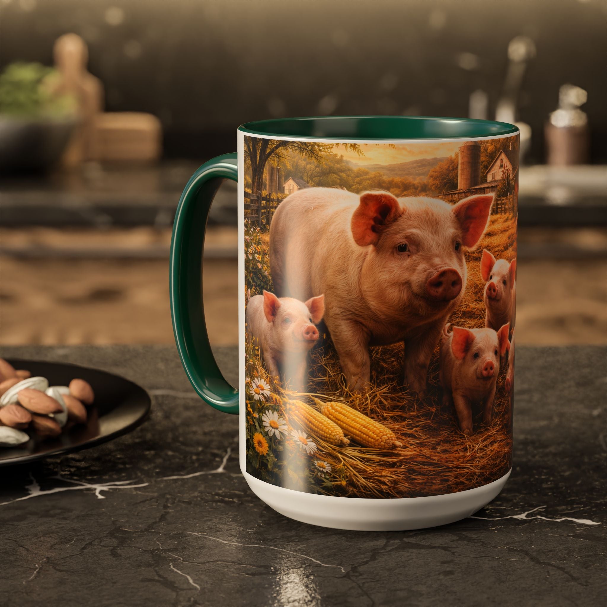 Add a touch of country charm to your day with this Adorable Pig Mug. Featuring a heartwarming design of a mother pig and her playful piglets in a peaceful farmyard, this artwork captures the joy and simplicity of life on the farm. Surrounded by golden straw, rustic barns, sunflowers, and fresh harvest details, the scene brings warmth and nostalgia to every sip.