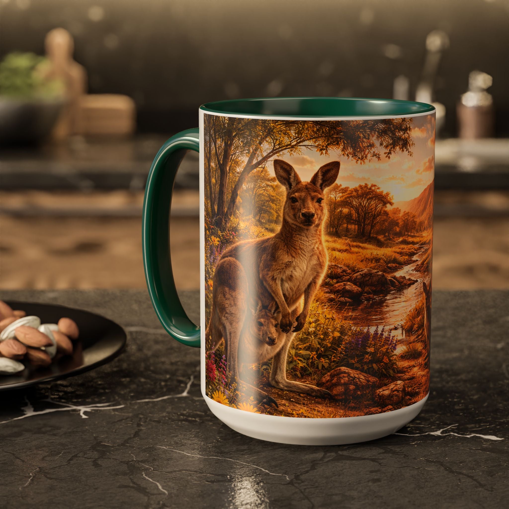 Bring the beauty of the Australian outback to your daily routine with this Kangaroo Family Mug. Featuring a detailed design of kangaroos gathered in a sunlit landscape, this artwork captures a peaceful family moment with a mother and her joey, a watchful adult kangaroo, and playful young joeys nearby. Golden light, wildflowers, eucalyptus trees, and a gentle stream create a serene panoramic scene that wraps seamlessly around the mug.