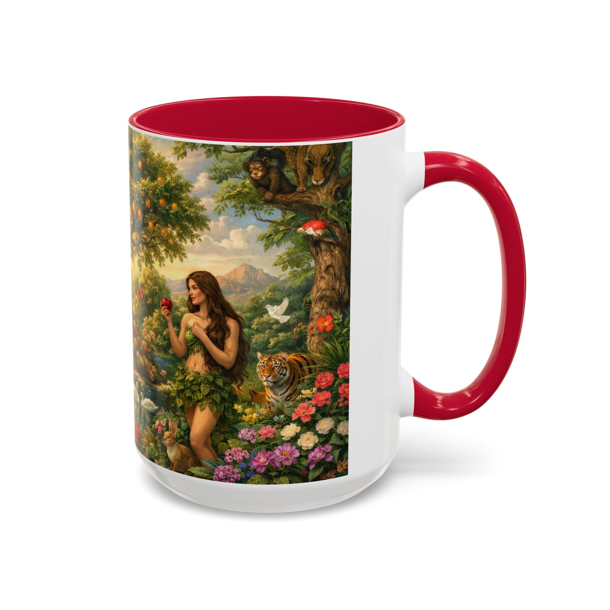 Bring timeless beauty and spiritual symbolism to your daily coffee or tea with this stunning Garden of Eden wrap mug. This panoramic design wraps seamlessly around the mug, featuring Adam and Eve peacefully positioned on either side of the radiant Tree of Life, which stands at the heart of the scene.