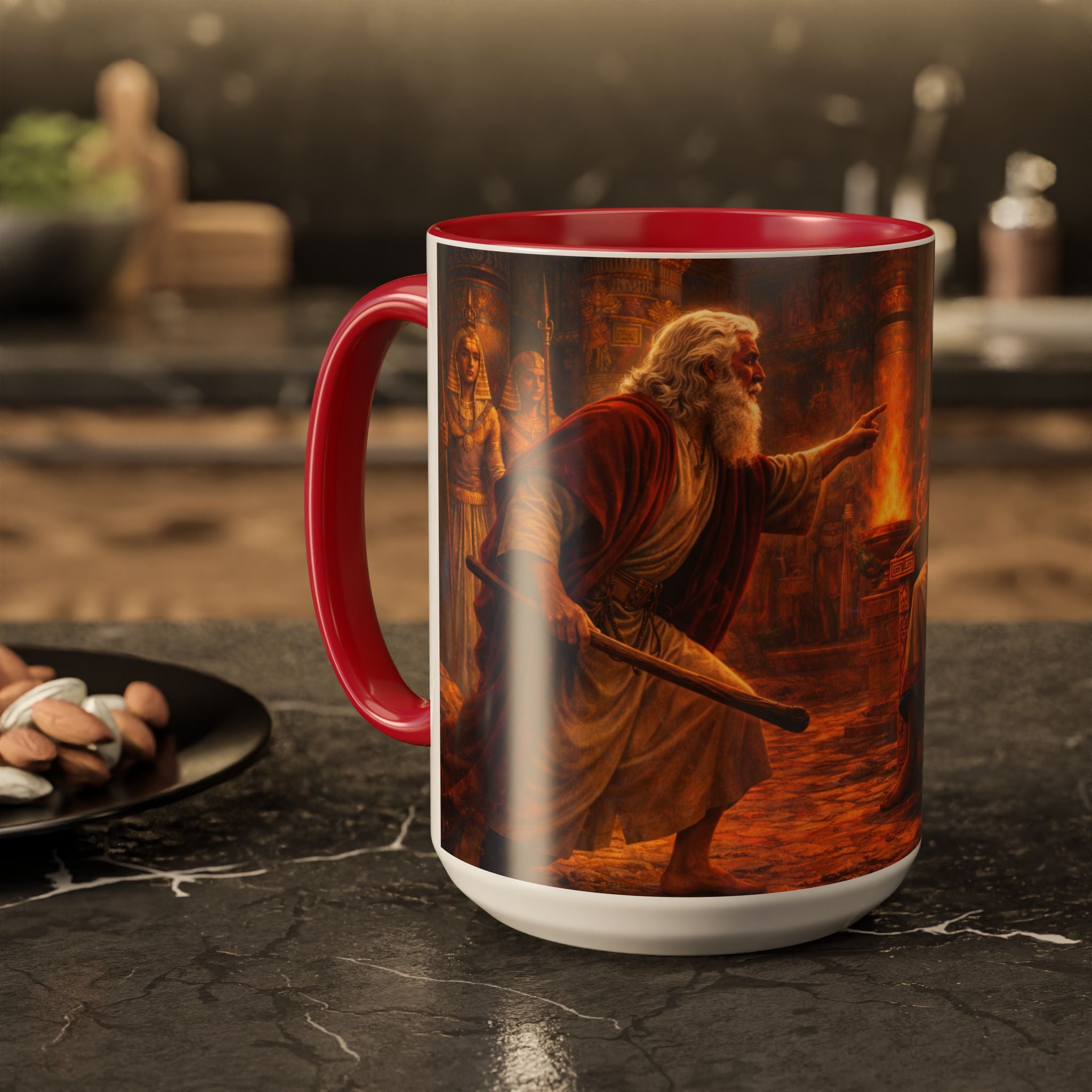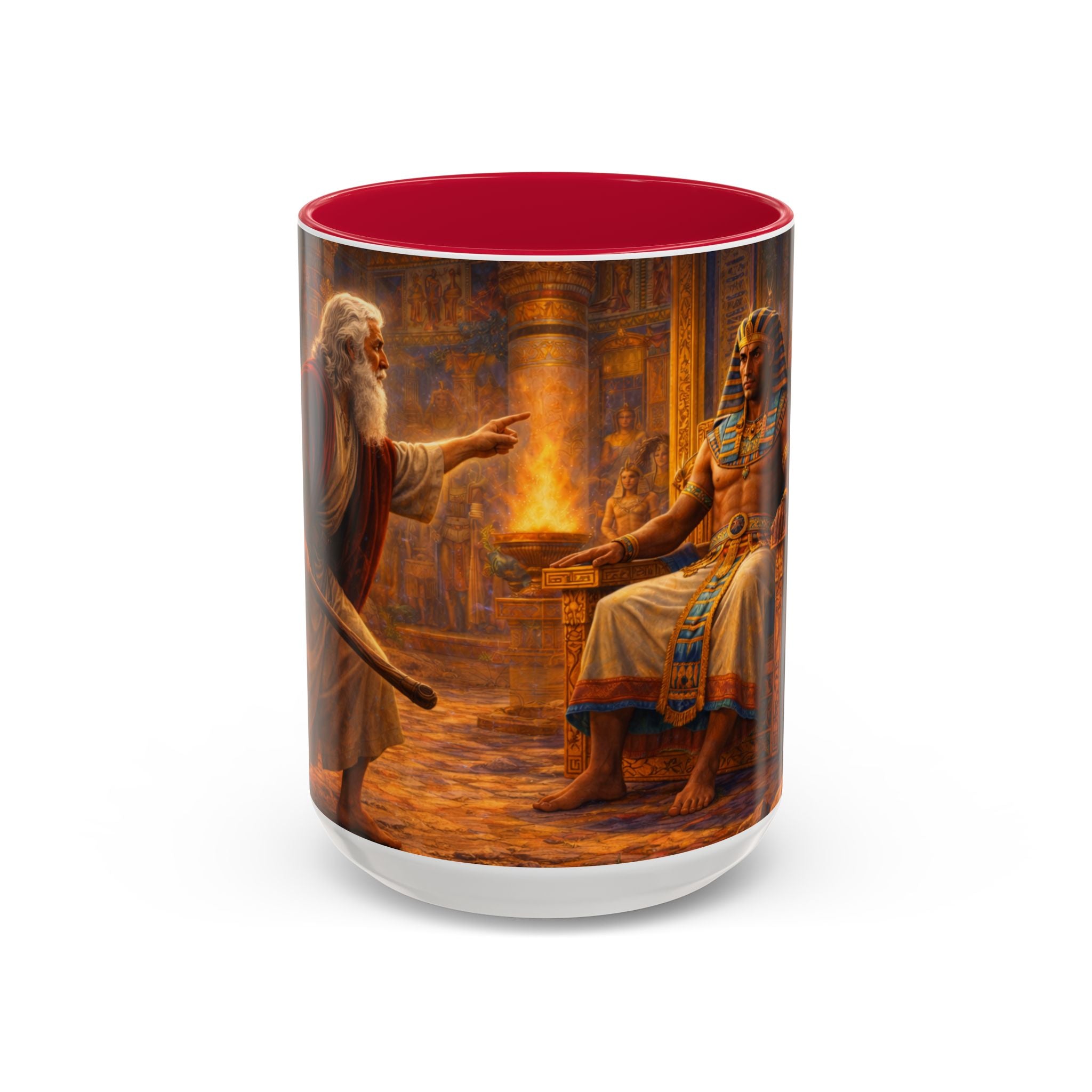 The panoramic design wraps seamlessly around the mug, depicting an aged Moses with white hair and beard, pointing boldly toward Pharaoh as he holds his staff—the symbol of God’s authority. Pharaoh sits upon his ornate throne, flanked by his queen and young son, surrounded by the grandeur of the Egyptian court. Rich golden tones, deep blues, and warm firelight illuminate the throne room, heightening the tension between earthly power and divine command.