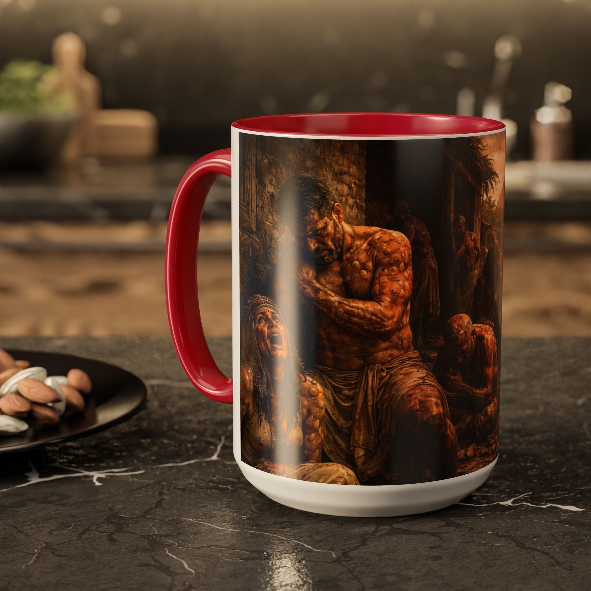 This striking mug design portrays The Sixth Plague of Egypt, when painful and unhealable boils broke out on the bodies of the Egyptian people, bringing widespread suffering throughout the land. Inspired by the biblical account in Exodus, the artwork focuses on human anguish and the inescapable nature of divine judgment.