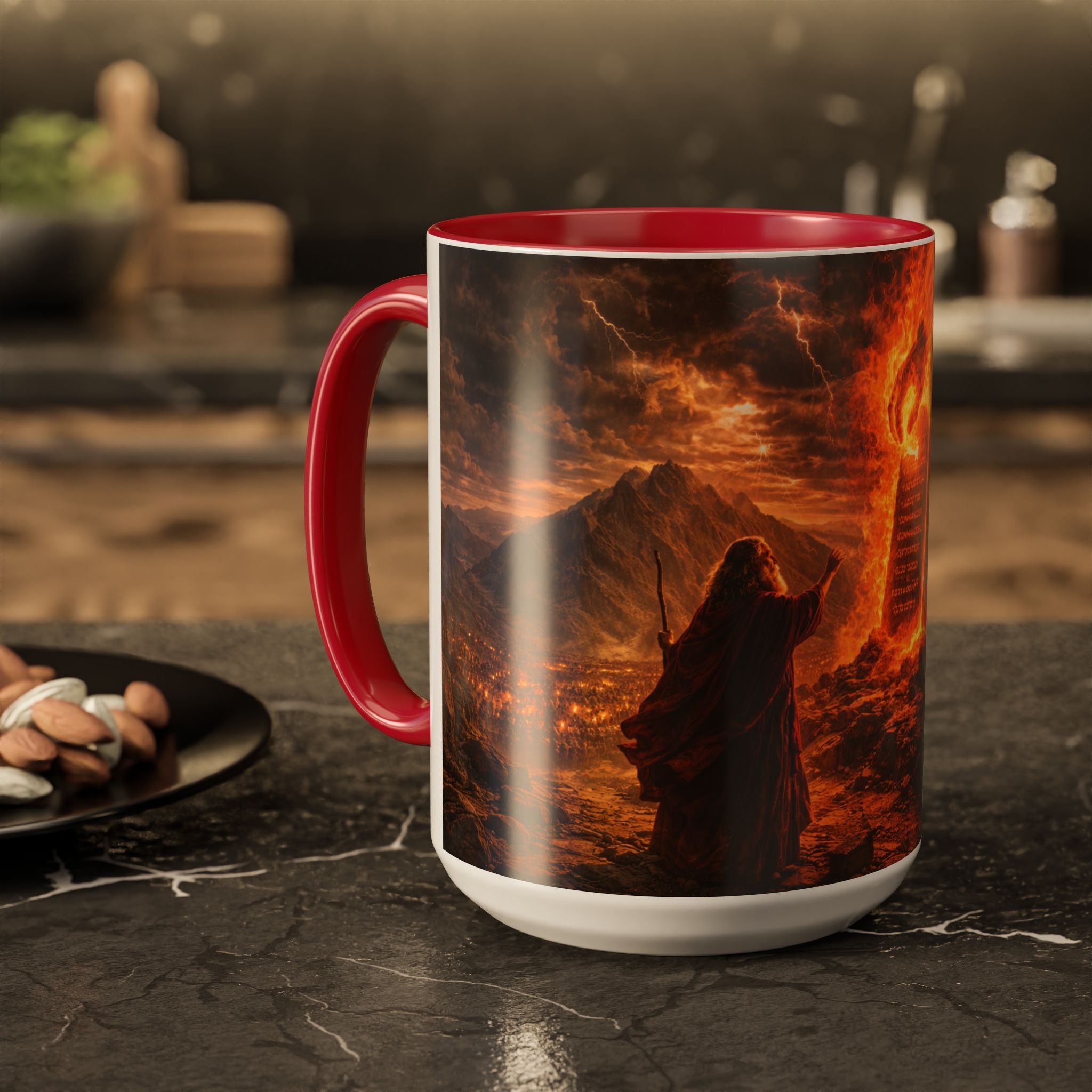 This awe-inspiring mug design captures the sacred moment at Mount Sinai, when God revealed His law to Moses and wrote the Ten Commandments with divine fire. Inspired by the biblical account in Exodus, the artwork reflects the holiness, power, and authority of God’s presence.