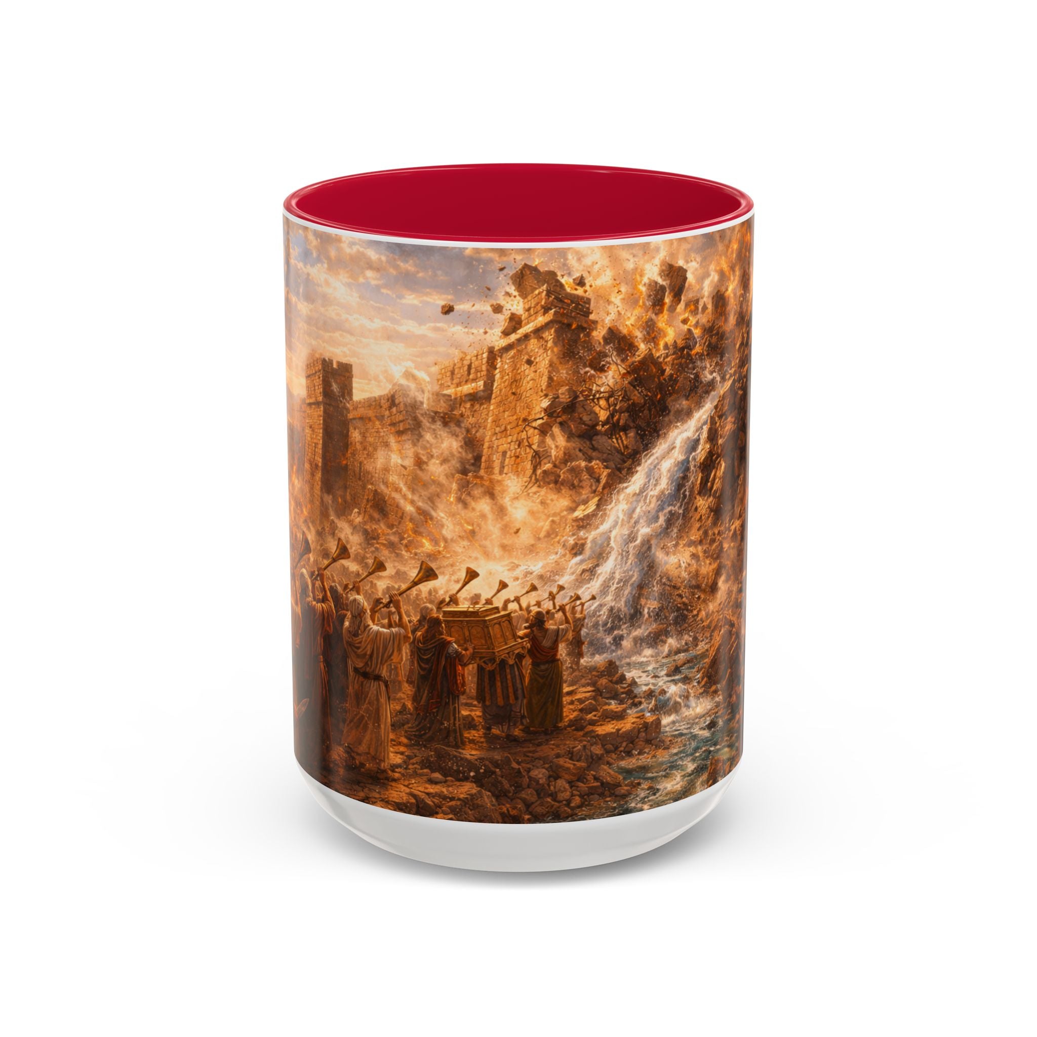 This dramatic mug design captures the miraculous victory at Jericho, when Joshua led the Israelites into the Promised Land by obeying the Lord’s command. Rather than fighting with weapons, the people marched around the city in faith, and on the seventh day, at the sound of the trumpets, the mighty walls came crashing down.