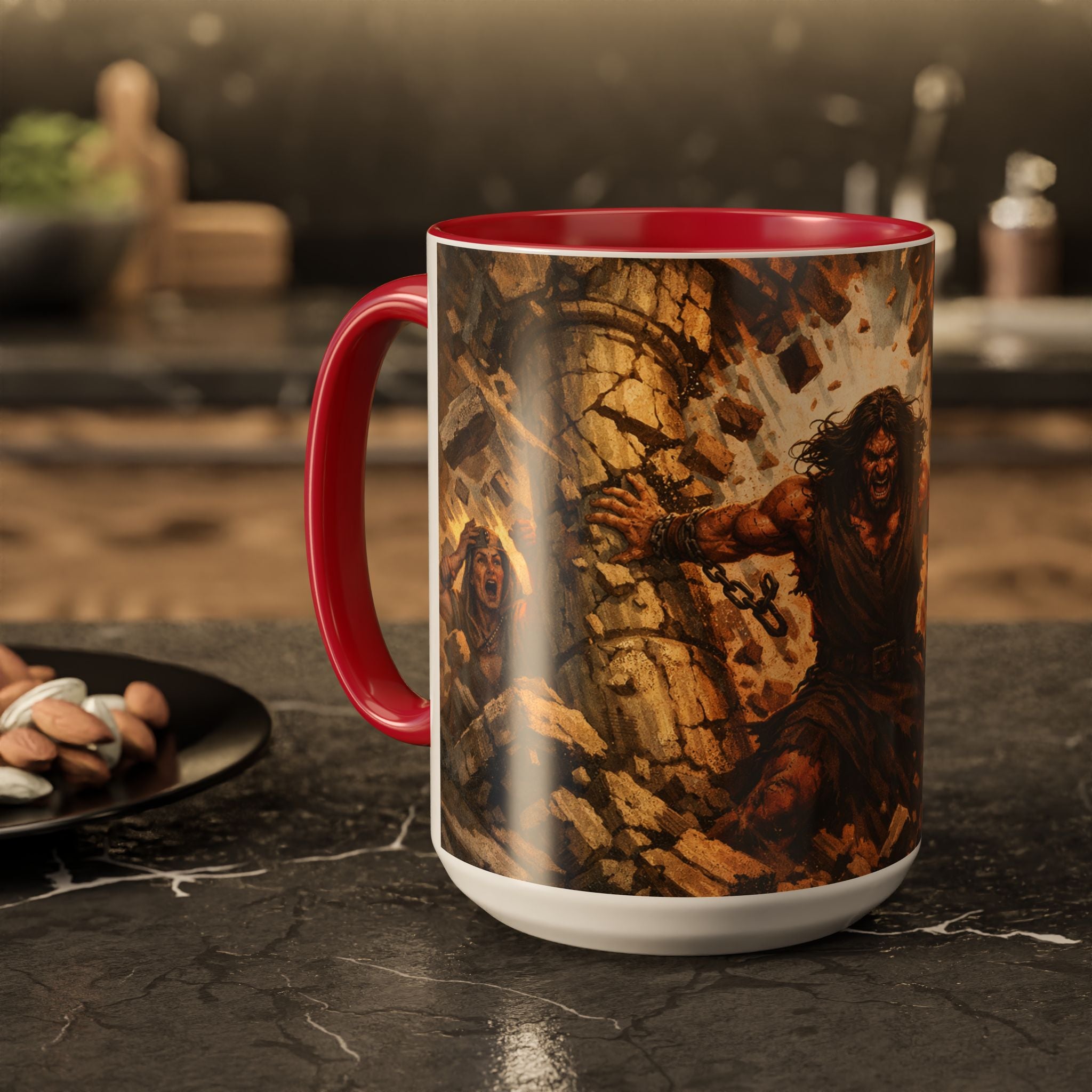 Experience one of the most powerful moments in biblical history every time you take a sip. This dramatic wraparound mug design captures Samson at the height of his God-given strength, pushing apart the massive stone pillars of the Philistine temple as it collapses around him. Crumbling stone, flying debris, and raw determination bring this iconic scene to life in vivid, cinematic detail.