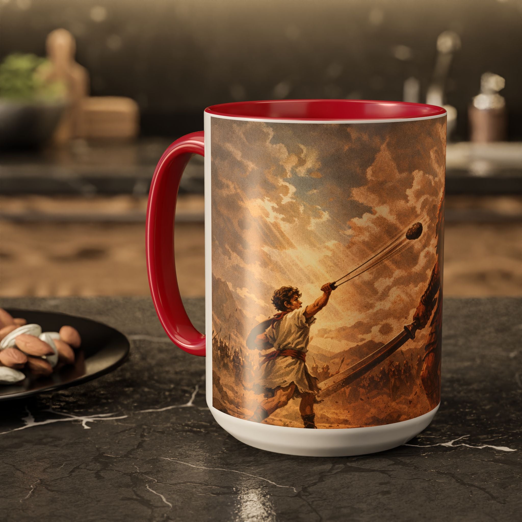 David is depicted mid-swing, releasing the stone from his sling, while Goliath stands as a full-bodied giant—seconds away from defeat. The dynamic scene wraps seamlessly around the mug, creating an immersive visual story that reminds us that even the smallest can overcome the greatest challenges.