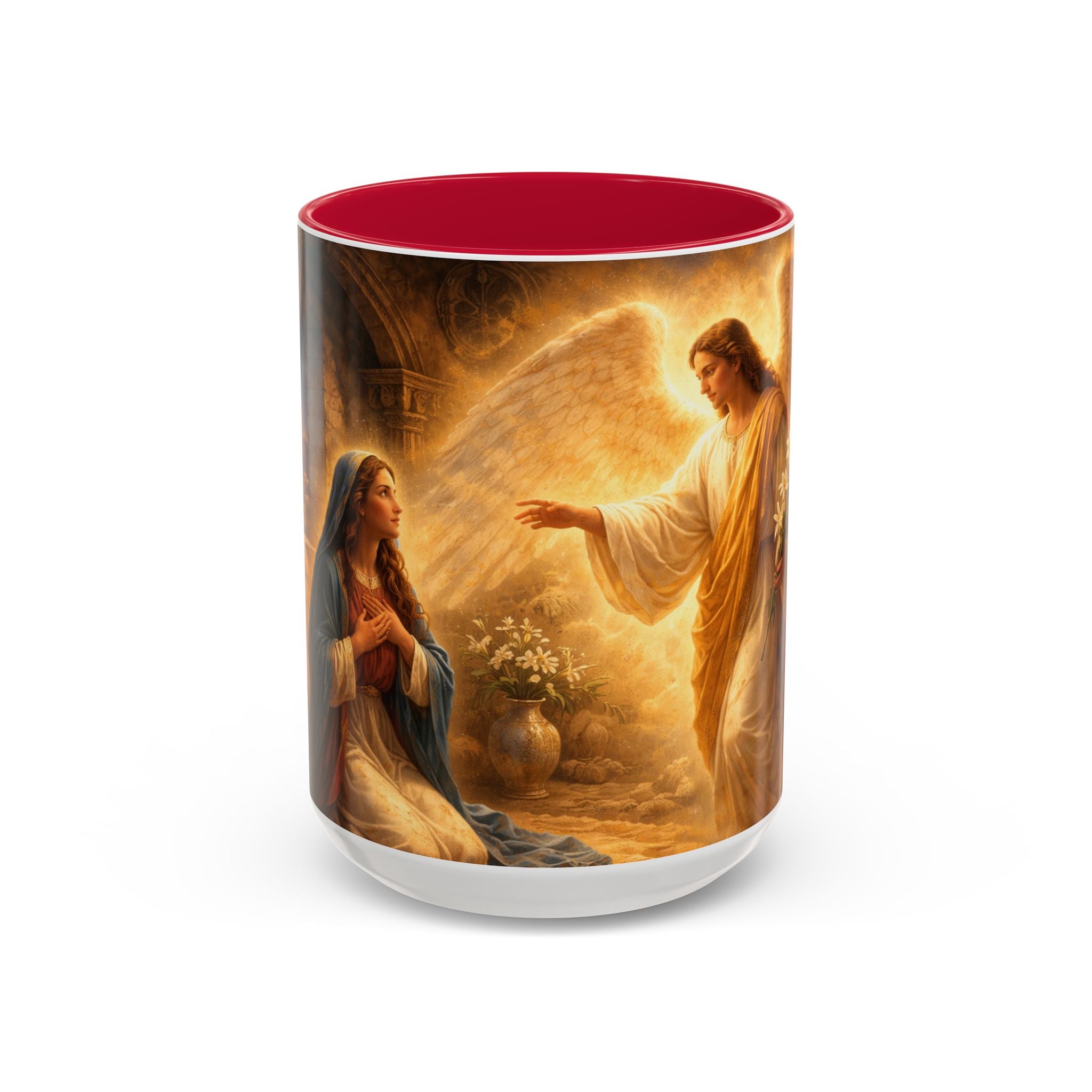 Experience the sacred moment of the Annunciation with this beautifully illustrated 15-ounce ceramic mug, featuring the angel Gabriel visiting Mary to announce that she will give birth to her son, Jesus. This wraparound design captures the awe, humility, and divine light of this life-changing encounter, bringing one of the most profound moments in Scripture to life.