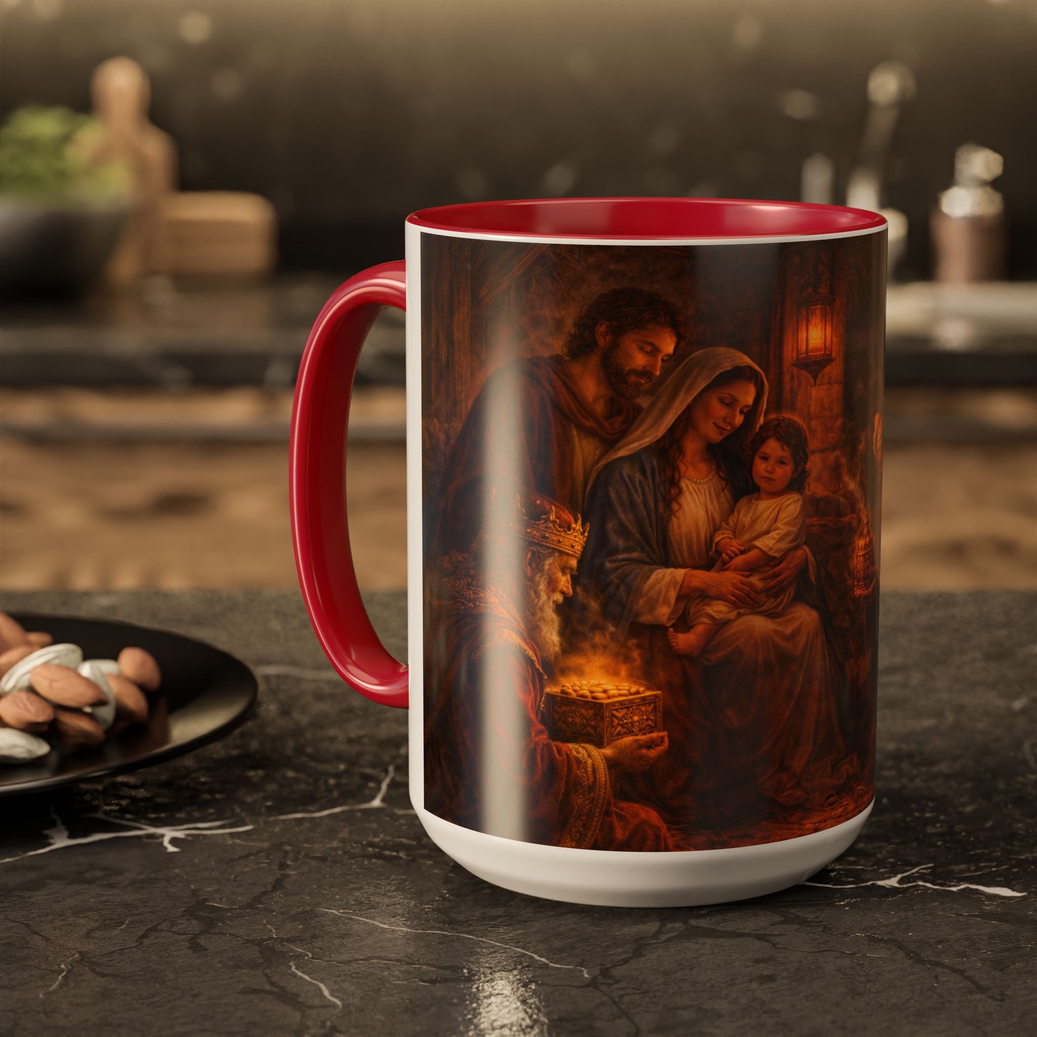 This glossy ceramic mug brings a quiet, reverent moment to your everyday routine. The wraparound illustration captures a warm nativity scene rendered in rich, painterly tones — candlelight, soft robes, and a guiding star — that feel like a pause in a busy day. Pick a contrasting handle and interior from 12 accent colors to make the scene pop on your shelf and match your holiday décor. The comfortable C-shaped handle and two size options let you sip slowly from an 11oz cup or settle in with a larger 15oz pour. Durable ORCA coating keeps the print bright and glossy through repeated dishwasher and microwave use, so that the artwork stays luminous with each morning coffee or evening tea.