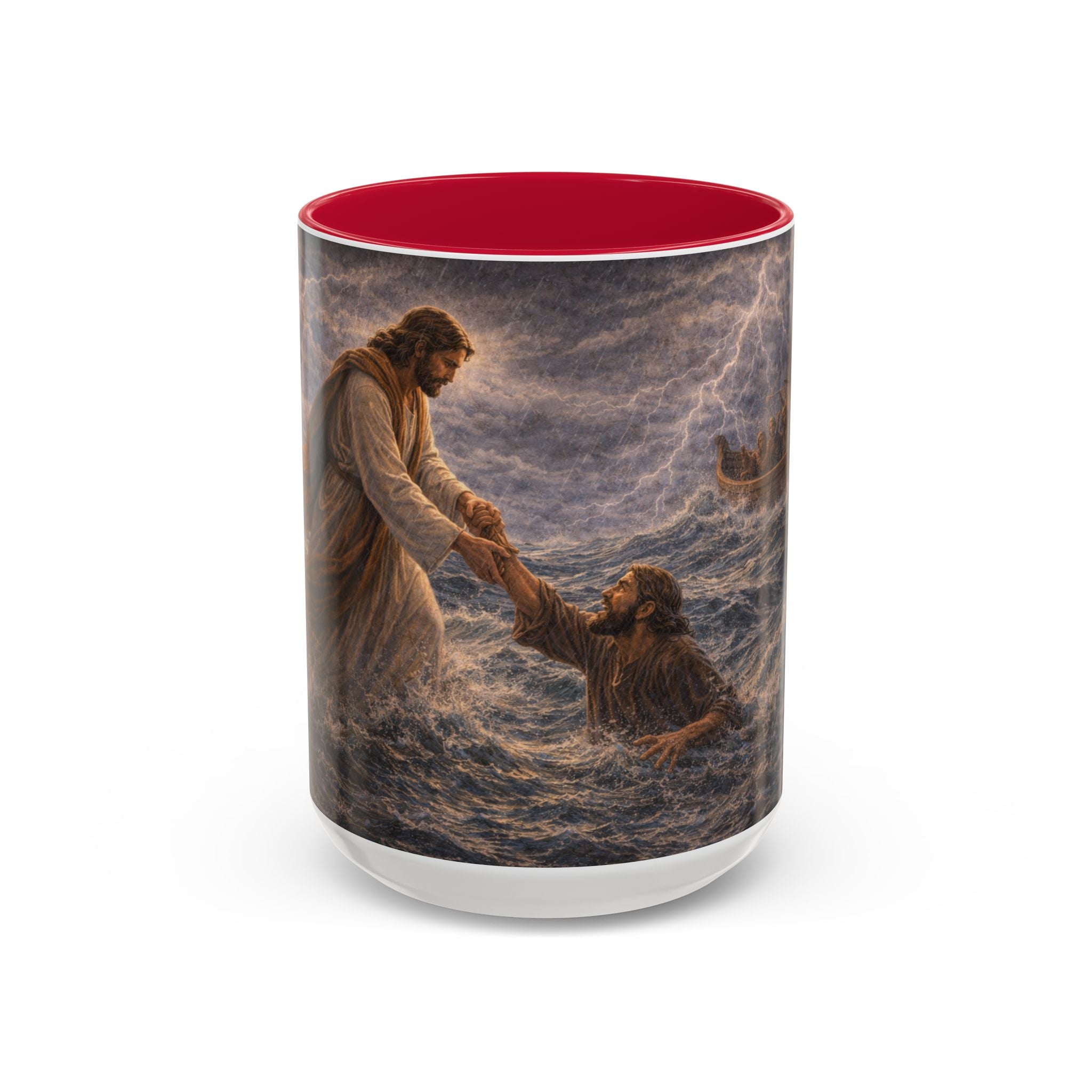 saving power with this beautifully illustrated 15-ounce ceramic mug, depicting the unforgettable moment when Jesus walked on the water and called Peter to step out of the boat. This full wraparound design captures the scene from the Gospels when faith overcame fear—until the storm caused Peter to falter and begin to sink.
