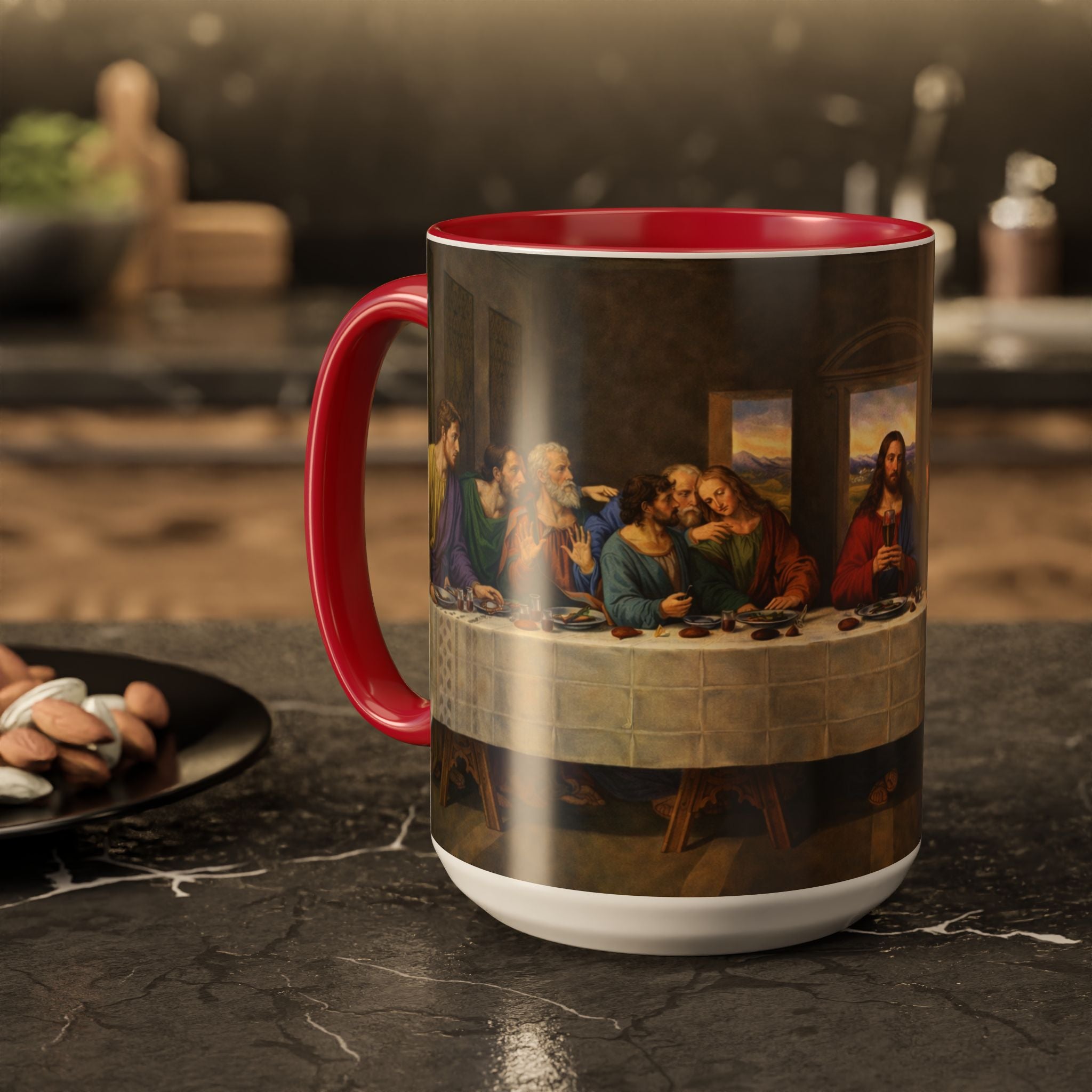 Jesus is seated at the center of the table, calm and intentional, lifting the cup with reverence as the twelve disciples react around Him with emotion, reflection, and wonder. The widened panoramic layout ensures that all twelve disciples are clearly present, creating a balanced and complete portrayal of this pivotal moment. Warm tones, rich colors, and careful detail bring depth and meaning to the scene as it unfolds around the mug.