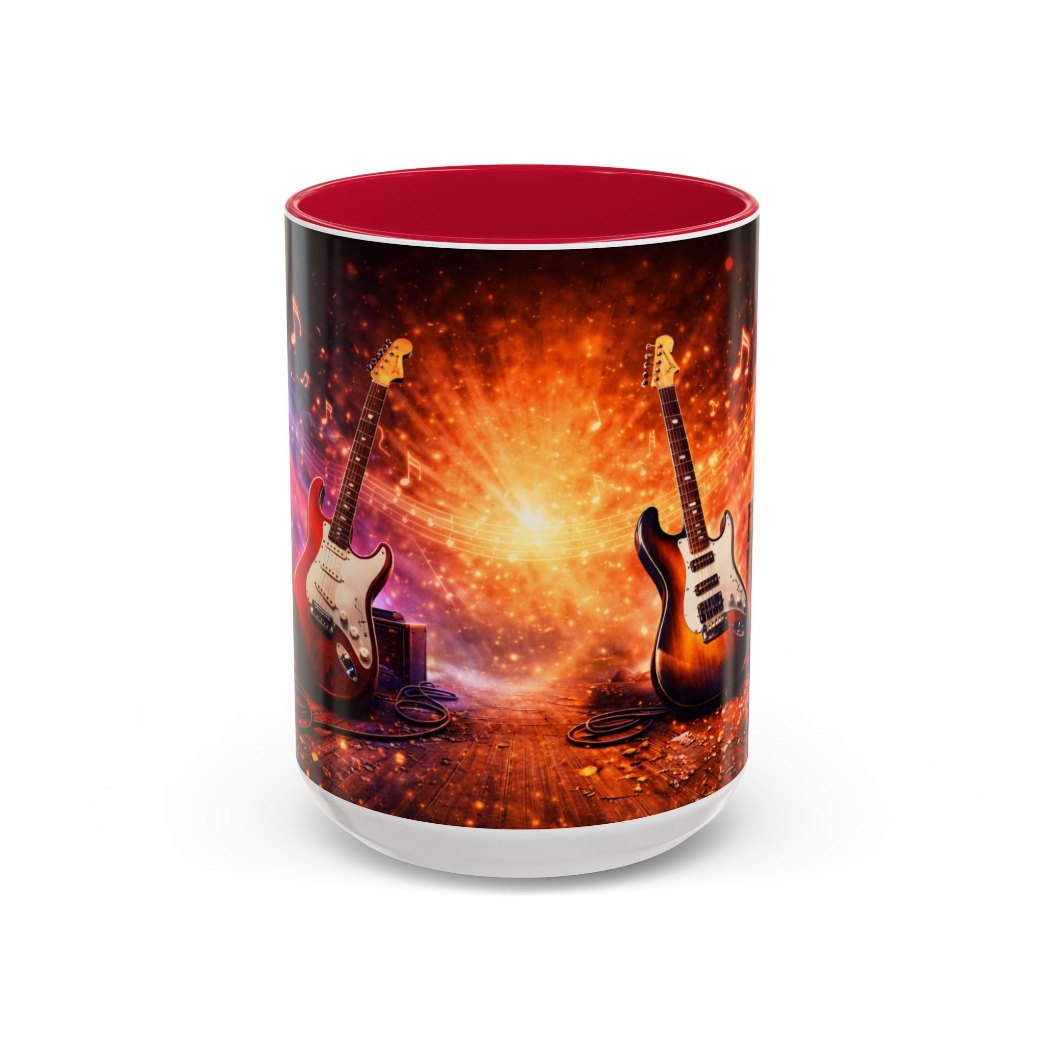 Turn up the volume on your daily routine with this striking 15-ounce electric guitar mug, designed for electric guitar players and music lovers who live for the energy of rock and live performance. This mug showcases powerful electric guitars set on a glowing stage, surrounded by amplifiers, pedals, cables, and vibrant lighting effects that capture the excitement of playing electric guitar.