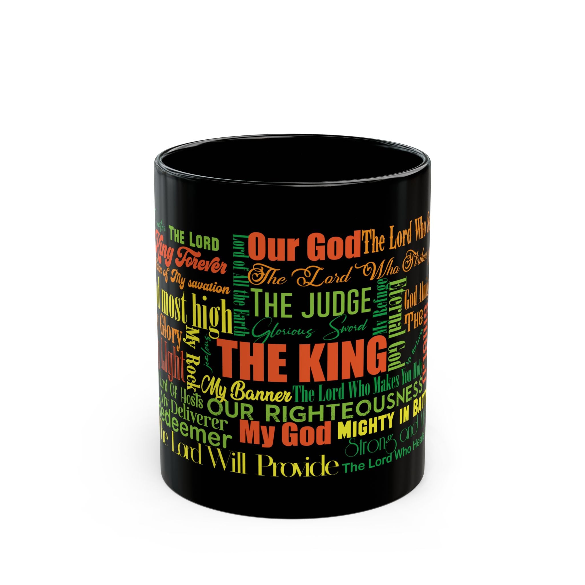 God Names Christian Black Coffee Mug The mug is made of the best quality ceramic and the design is printed and sublimated. This elegant mug has God's names printed in different colors like green, red and yellow on one side of the mug and the print is displays on a clean black background. Has a domed handle, and serves as a durable ceramic stoneware for your favorite hot or cold beverage