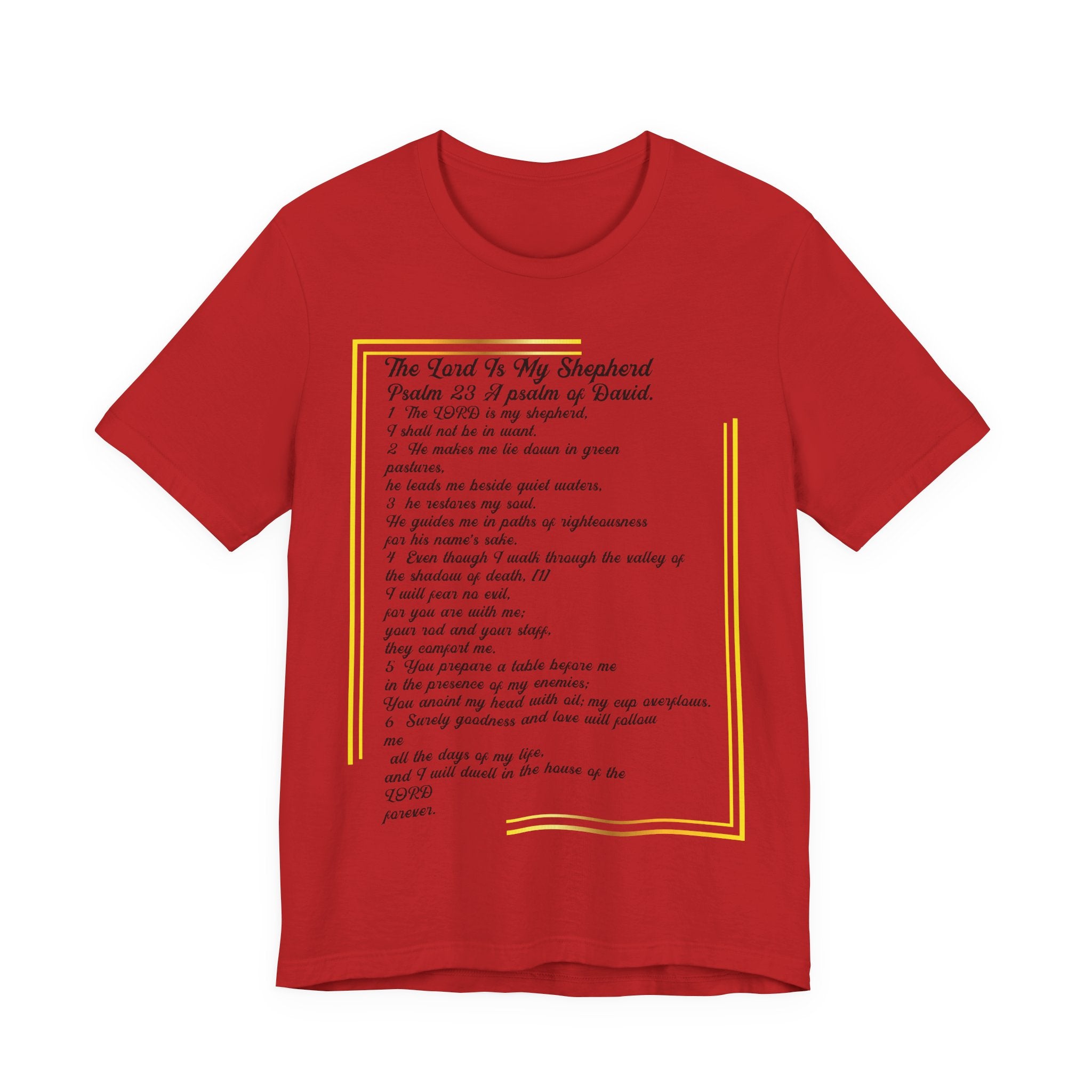 This Psalm 23 Christian Religious T-shirt: The Lord is my Shepherd is a beautiful design with a religious and biblical lovers. It shows a black inscription of the biblical verse from Psalm 23, surrounded by a beautifully drawn golden outline. It is printed on a clean red background. Perfect gift for family and friends at church. Use it for church gatherings or family gatherings.