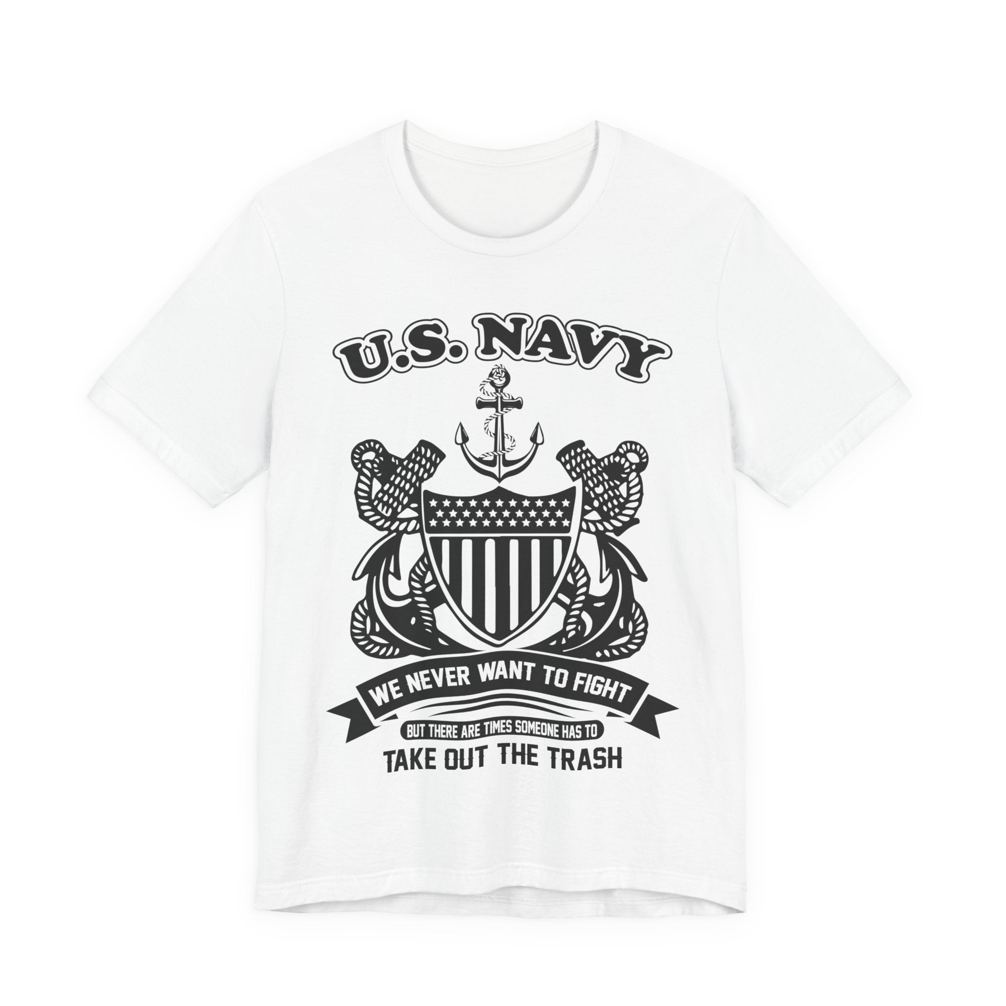 On the front there is a picture of the Navy symbol, above it is written US Navy and below it "We never want to fight, but sometimes someone has to, take out the trash." All of this is printed on a pure white background.