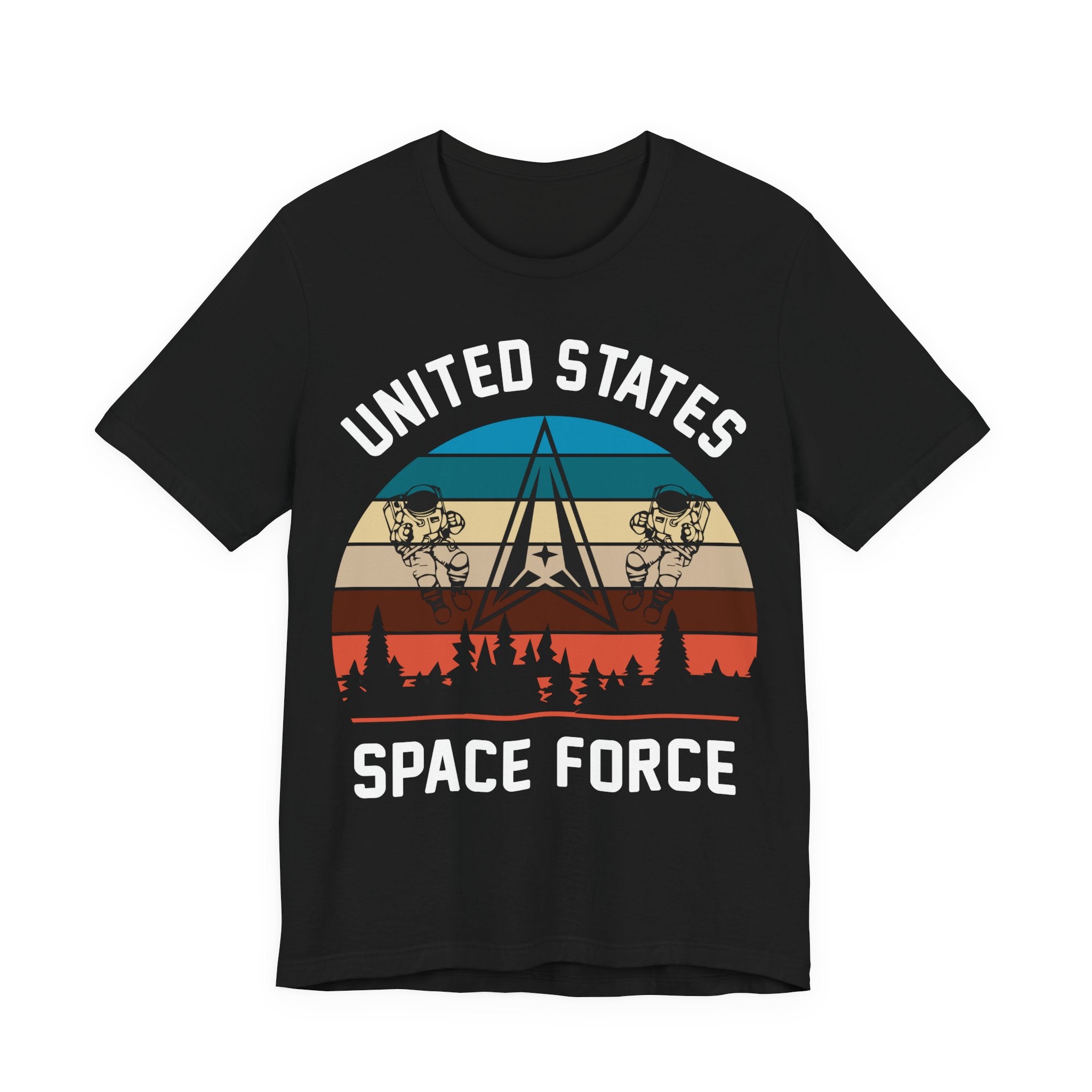 Our US Space Force t-shirt features the two-stage “United States” "Space Force". Amid this is a beautiful graphics showing the two space ship forces. The graphics is printed on a beautiful black background. This is a medium weight tee, slightly lighter than the wholesale market tee, though substantial or not see-through. It is a good balance between comfort and durability.